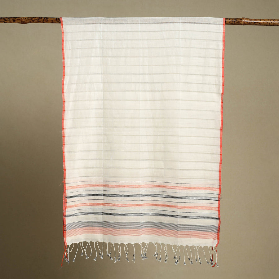 This srikakulam white jamdani cotton stole with tassels beautifully reflects the rich textile heritage of Andhra Pradesh. Woven from soft, breathable cotton, it features intricate jamdani motifs skillfully crafted using the supplementary weft technique. Adorned with delicate tassels, this stole seamlessly blends tradition with modern versatility, making it an elegant accessory for both ethnic and contemporary ensembles.