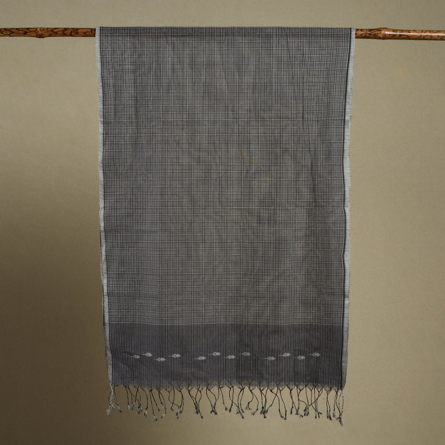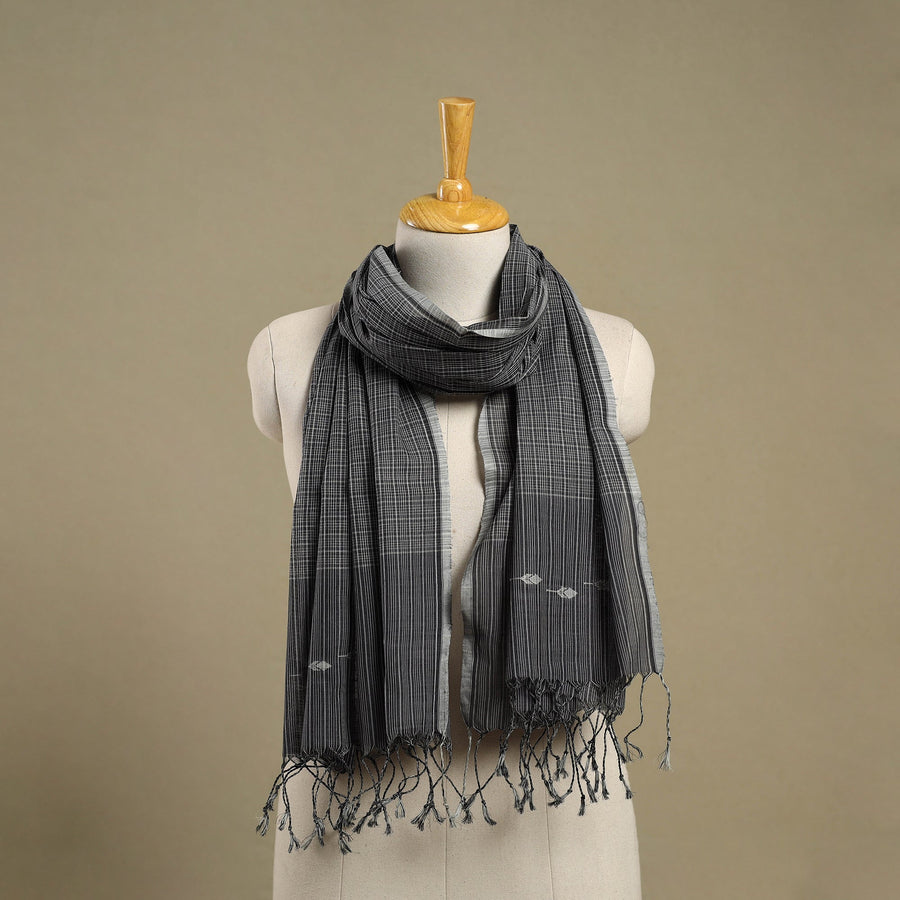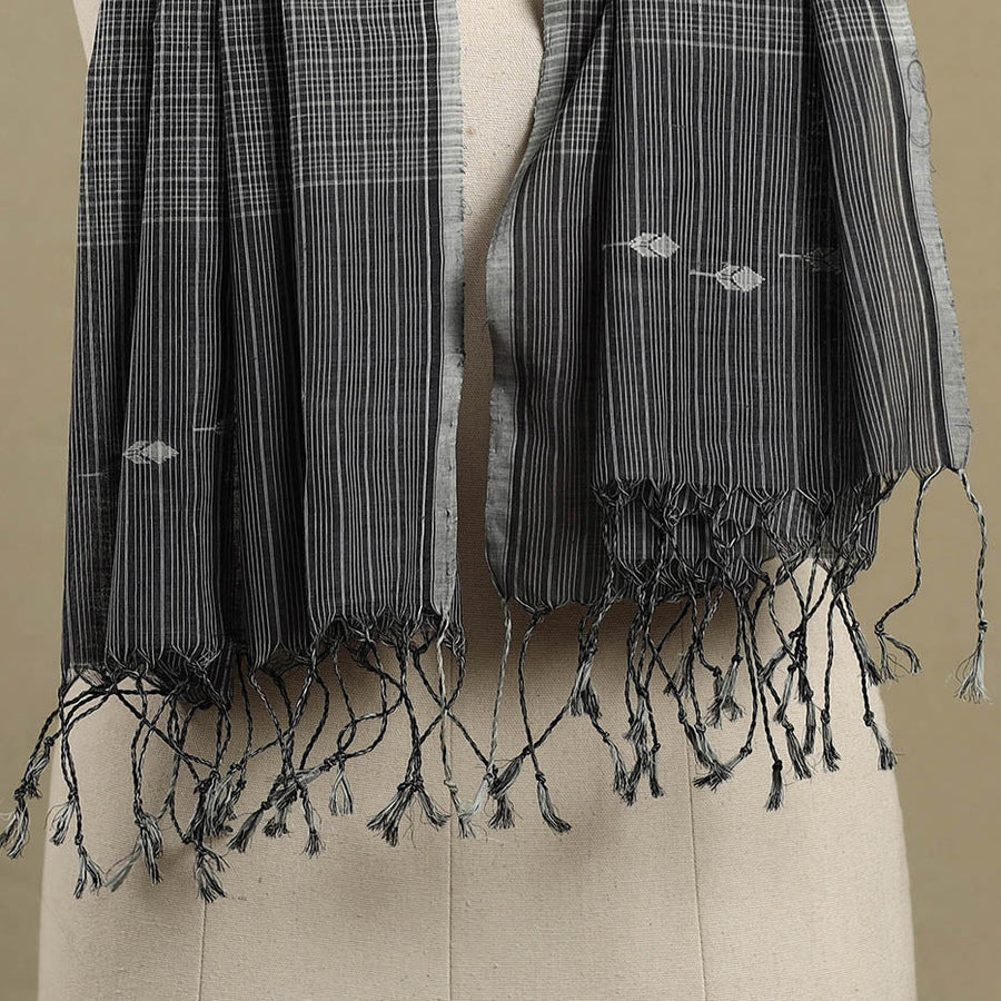 This srikakulam grey jamdani cotton stole with tassels beautifully reflects the rich textile heritage of Andhra Pradesh. Woven from soft, breathable cotton, it features intricate jamdani motifs skillfully crafted using the supplementary weft technique. Adorned with delicate tassels, this stole seamlessly blends tradition with modern versatility, making it an elegant accessory for both ethnic and contemporary ensembles.