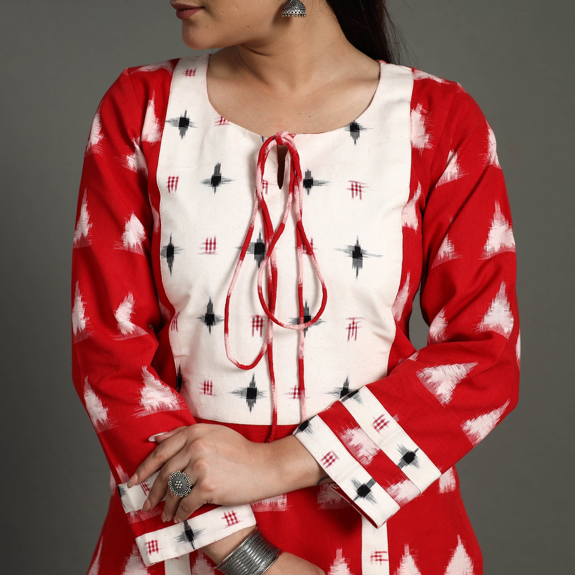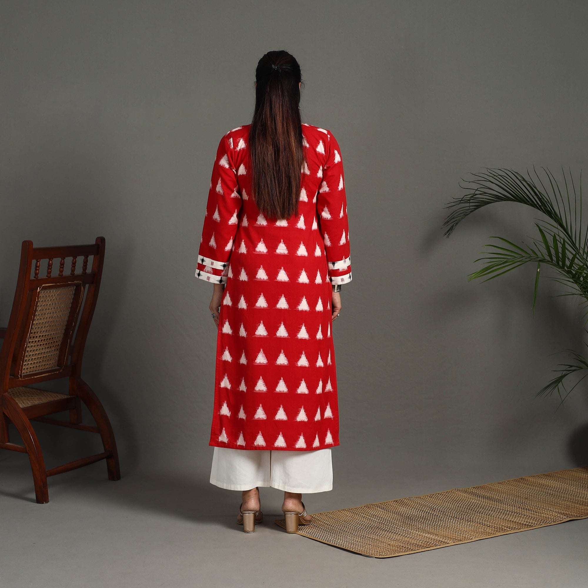 Experience the beauty of Indian ikat with our straight red pochampally double ikat kurta with patchwork. Crafted from breathable handloom cotton, it showcases vibrant patterns created using traditional ikat techniques. Perfect for casual outings and festive occasions, this kurta features a stylish side pocket, adding both convenience and elegance to your look.