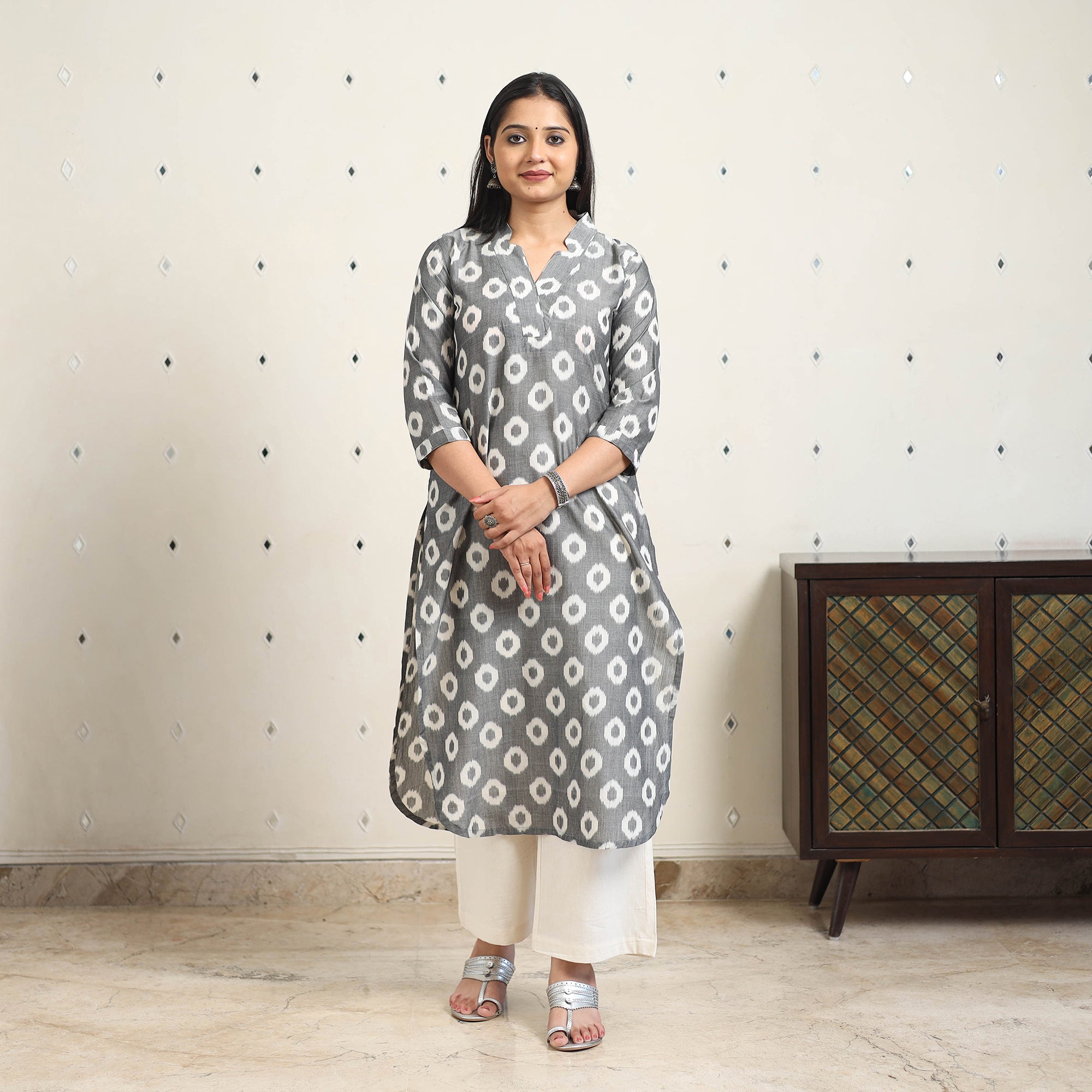 This grey handloom mercerized cotton pochampally Ikat kurta highlights the traditional weaving heritage of Telangana. It features a comfortable straight fit and a functional side pocket. The Ikat technique, where the yarns are resist-dyed before weaving, results in intricate, vibrant patterns. Perfect for everyday wear, office settings, casual outings, or relaxed gatherings.