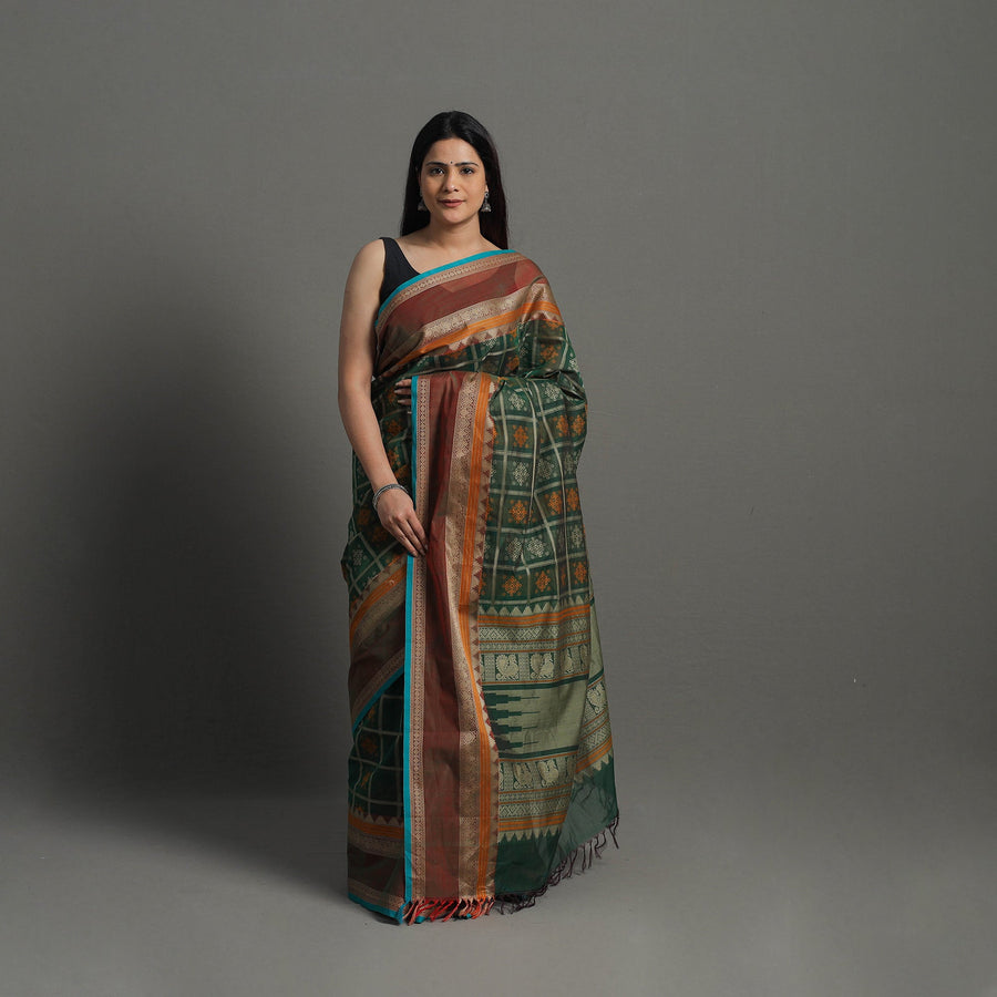 Celebrate the timeless elegance of traditional handloom cotton thread border kanchipuram saree, handwoven in Tamil Nadu's temple city. These cotton sarees from Kanchi are a spin on the Konrad temple sarees of Tamil Nadu that were used as a drape for deities. Adorned with signature temple borders, wide pallavs, and temple-inspired motifs, these sarees reflect centuries-old traditions. They are crafted with care and attention to detail, Perfect for cultural festivities or everyday wear