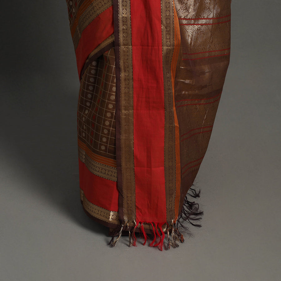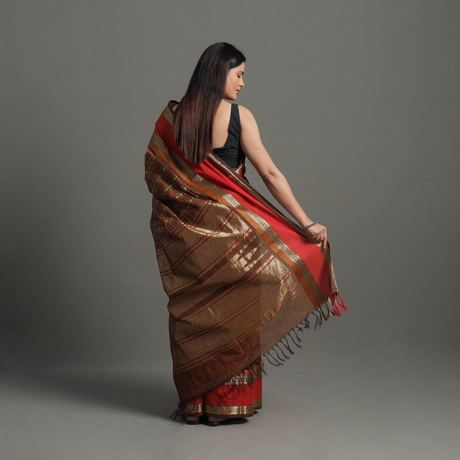 Celebrate the timeless elegance of traditional handloom cotton zari border kanchipuram saree, handwoven in Tamil Nadu's temple city. These cotton sarees from Kanchi are a spin on the Konrad temple sarees of Tamil Nadu that were used as a drape for deities. Adorned with signature temple borders, wide pallavs, and temple-inspired motifs, these sarees reflect centuries-old traditions. They are crafted with care and attention to detail, Perfect for cultural festivities or everyday wear