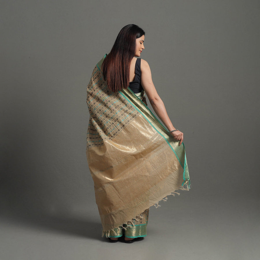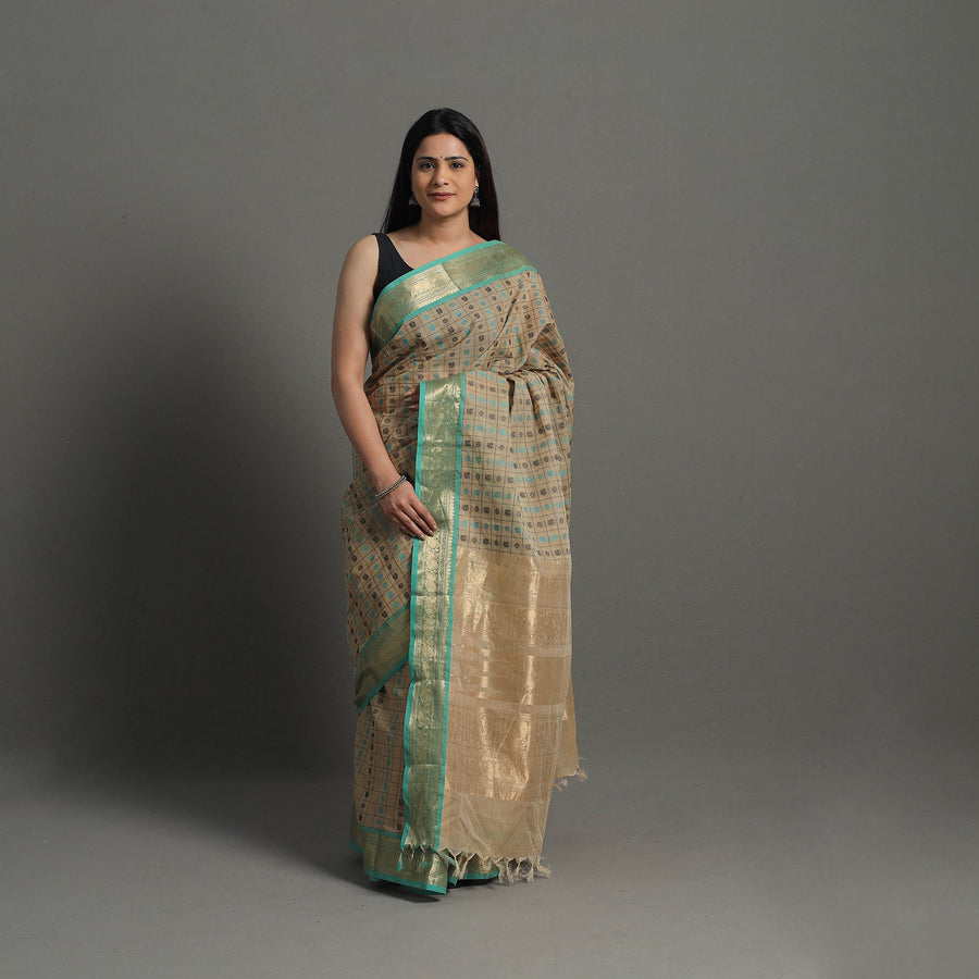 Celebrate the timeless elegance of traditional handloom cotton zari border kanchipuram saree, handwoven in Tamil Nadu's temple city. These cotton sarees from Kanchi are a spin on the Konrad temple sarees of Tamil Nadu that were used as a drape for deities. Adorned with signature temple borders, wide pallavs, and temple-inspired motifs, these sarees reflect centuries-old traditions. They are crafted with care and attention to detail, Perfect for cultural festivities or everyday wear