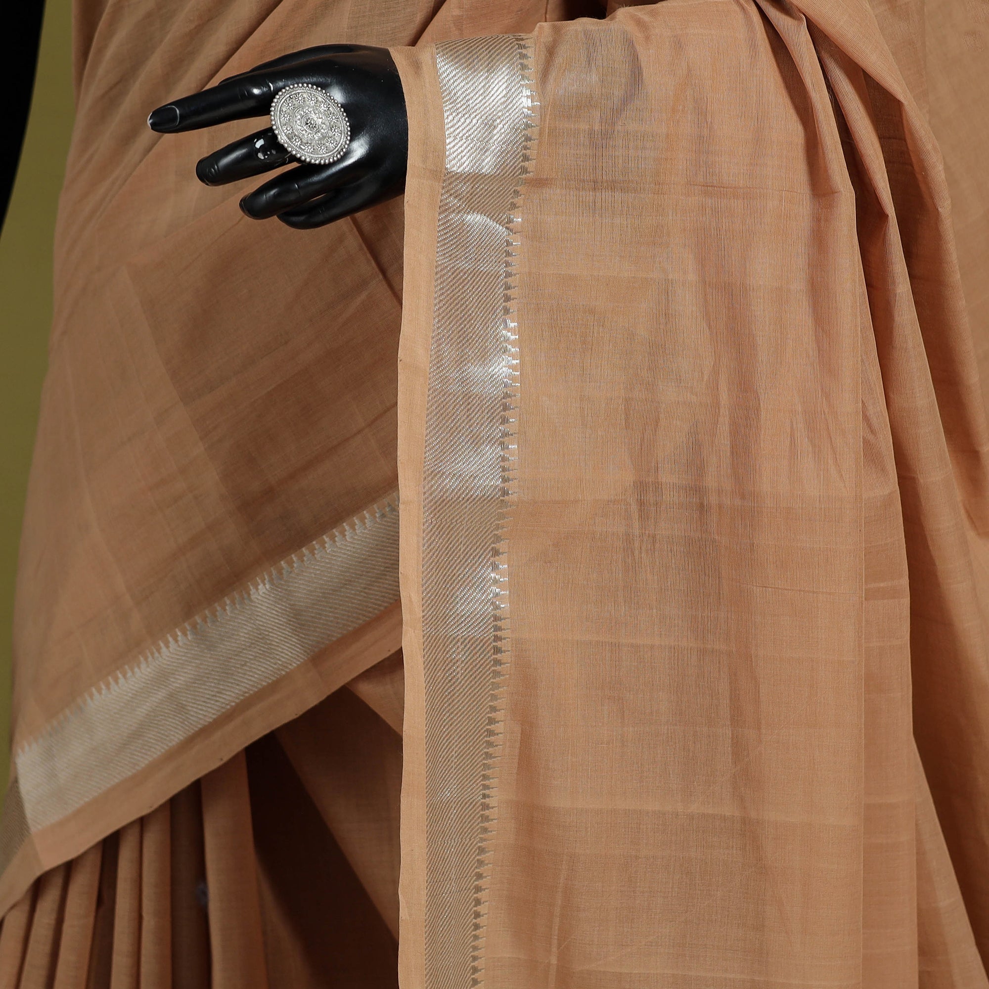 Add a touch of graceful elegance to your look with a beige mangalagiri handloom cotton saree from Andhra Pradesh. Known for its fine texture and beauty, this saree blends breathable comfort with traditional charm. The zari border adds a subtle shimmer, while the cotton makes it ideal for everyday wear. Finished with elegant tassels, it’s perfect for casual outings, family gatherings, or festive occasions.