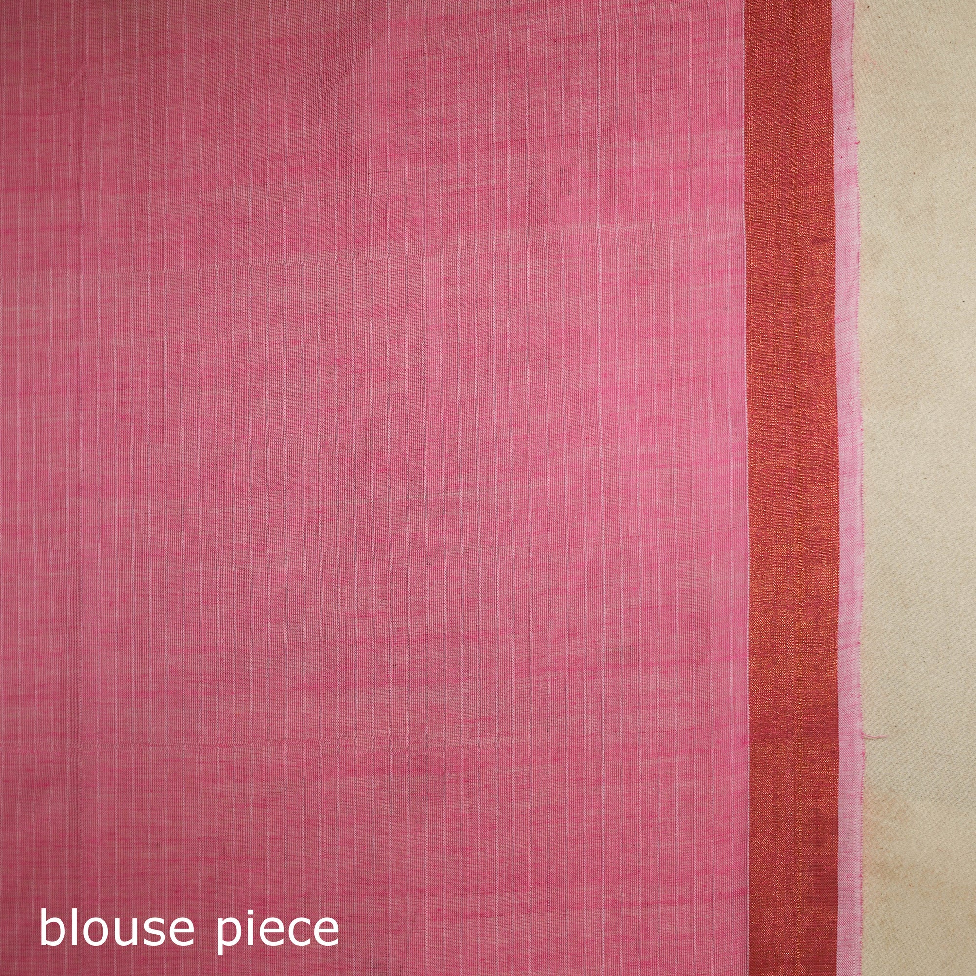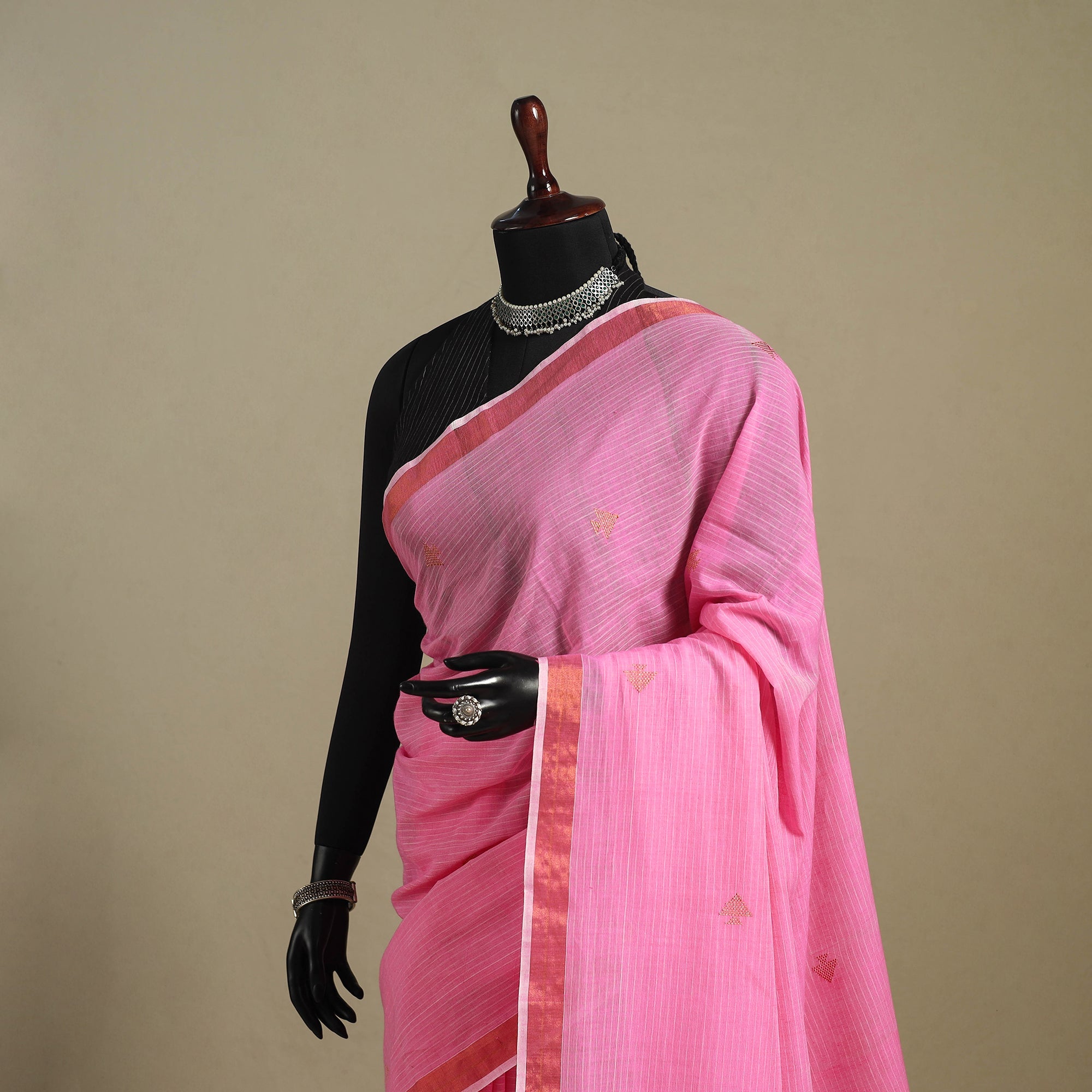 This pink phulia jamdani saree is crafted in fine cotton with shimmering zari buti motifs. The traditional extra-weft weaving of Bengal brings out designs that seem like delicate embroidery woven directly into the fabric. With metallic and dyed threads enhancing every detail, the saree carries an aura of grace and refinement. Such detailed weaving demands exceptional patience and artistry, making each piece a timeless treasure ideal for weddings, cultural festivities, special ceremonies, or refined evening wear.