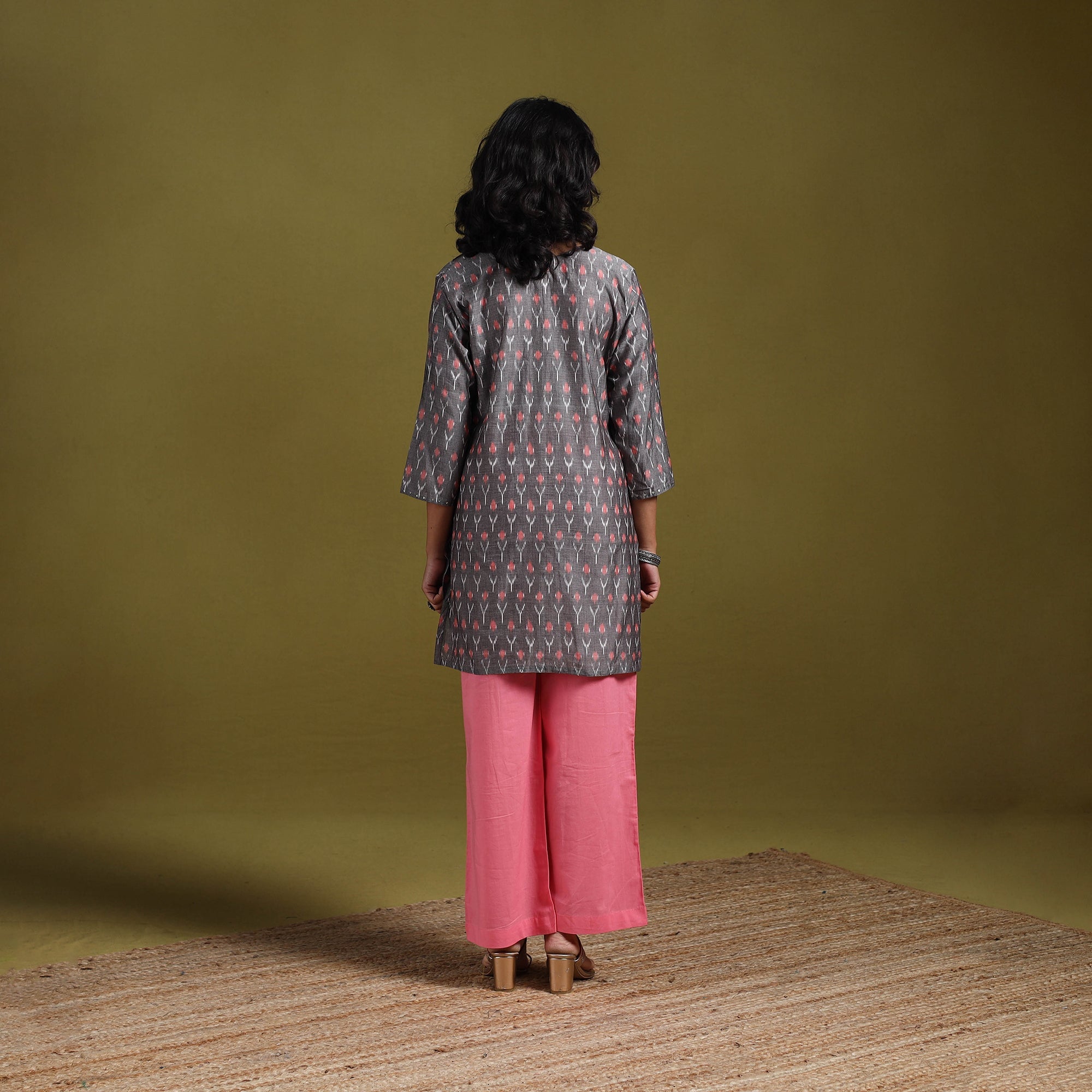 Grey handloom mercerised cotton hand embroidered short pochampally ikat weave kurta is made using a resist-dye process where the yarns are dyed before weaving to create detailed geometric patterns. Its relaxed fit makes it suitable for office wear, casual outings and weekend plans.