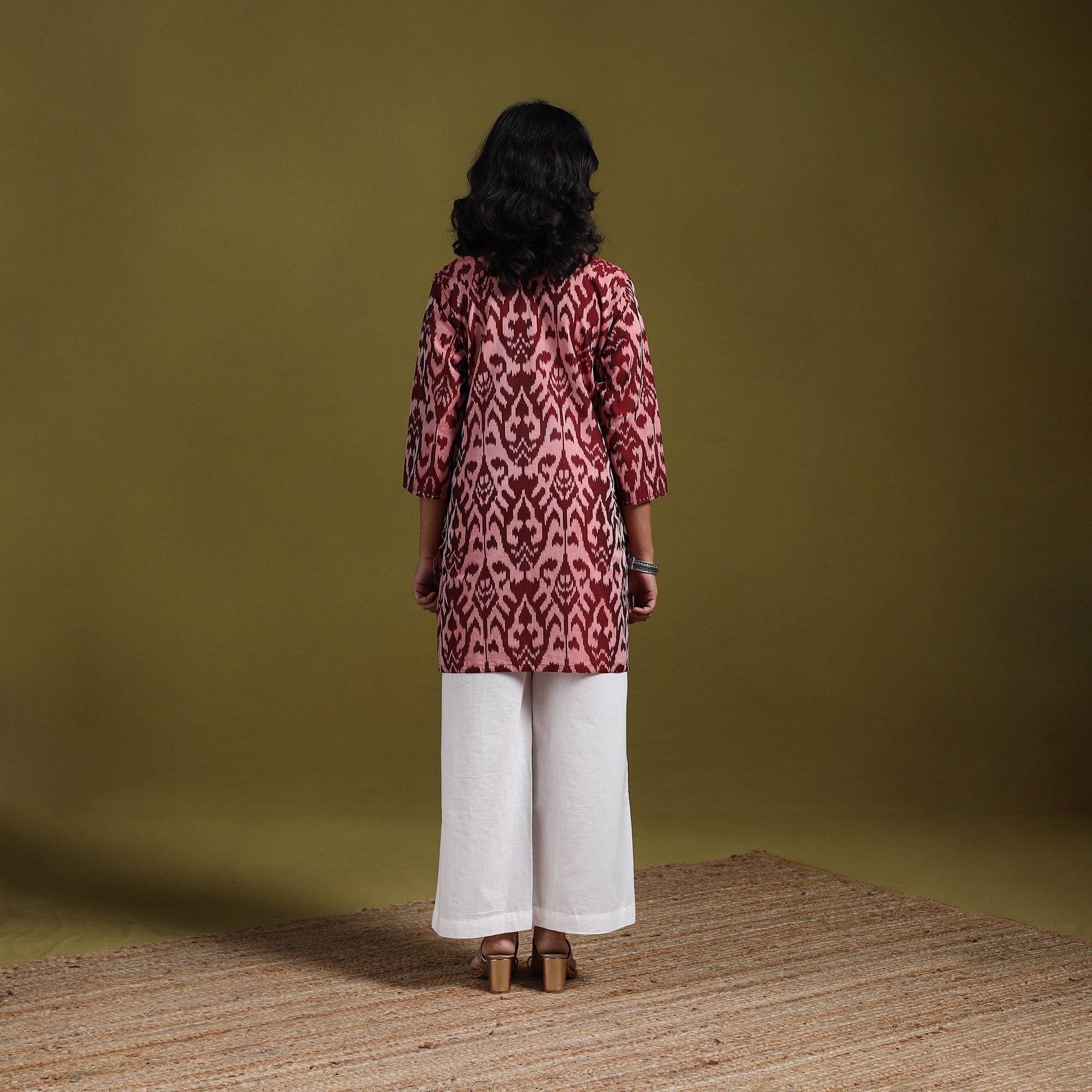 Handloom mercerised cotton hand embroidered short pochampally ikat weave kurta is made using a resist-dye process where the yarns are dyed before weaving to create detailed geometric patterns. Its relaxed fit makes it suitable for office wear, casual outings and weekend plans.