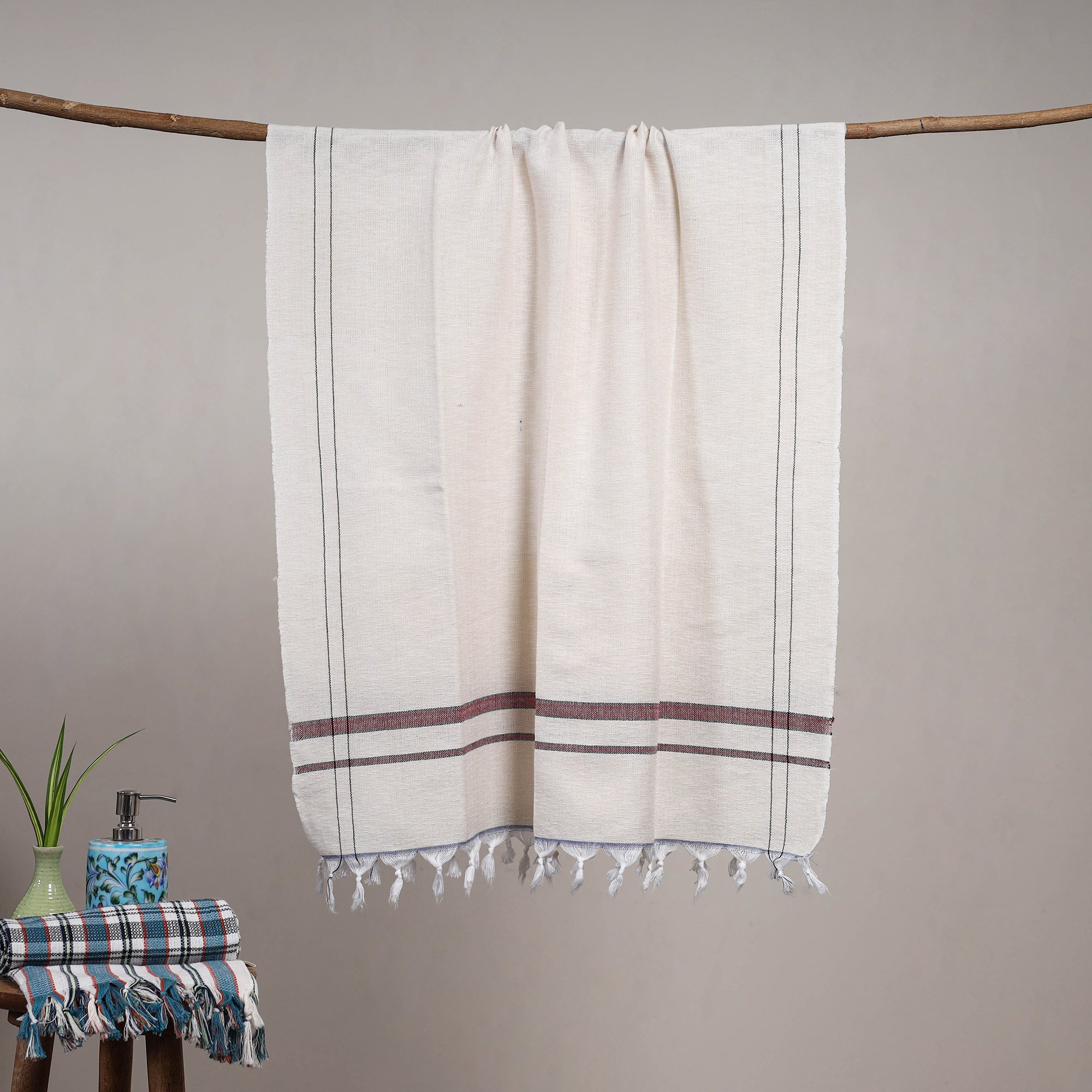 This white bath towel, crafted from fine handloom cotton, is soft, breathable, and highly absorbent. Lightweight yet durable, it dries quickly and stays gentle on the skin, making it perfect for everyday use. Woven by skilled artisans, it provides better breathability and comfort compared to mill-made towels