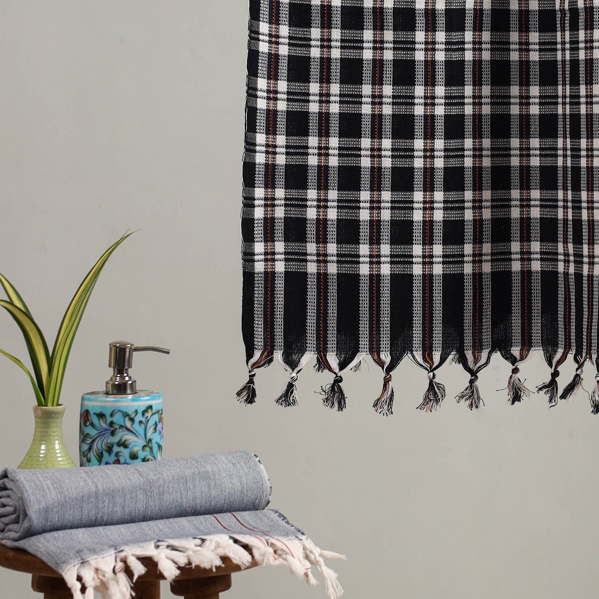 Made from fine handloom cotton, this black checks bath towel is soft, lightweight, and highly absorbent. Woven by skilled artisans, it offers better breathability and comfort compared to mill-made towels. Ideal for everyday use, it dries quickly and stays gentle on the skin.