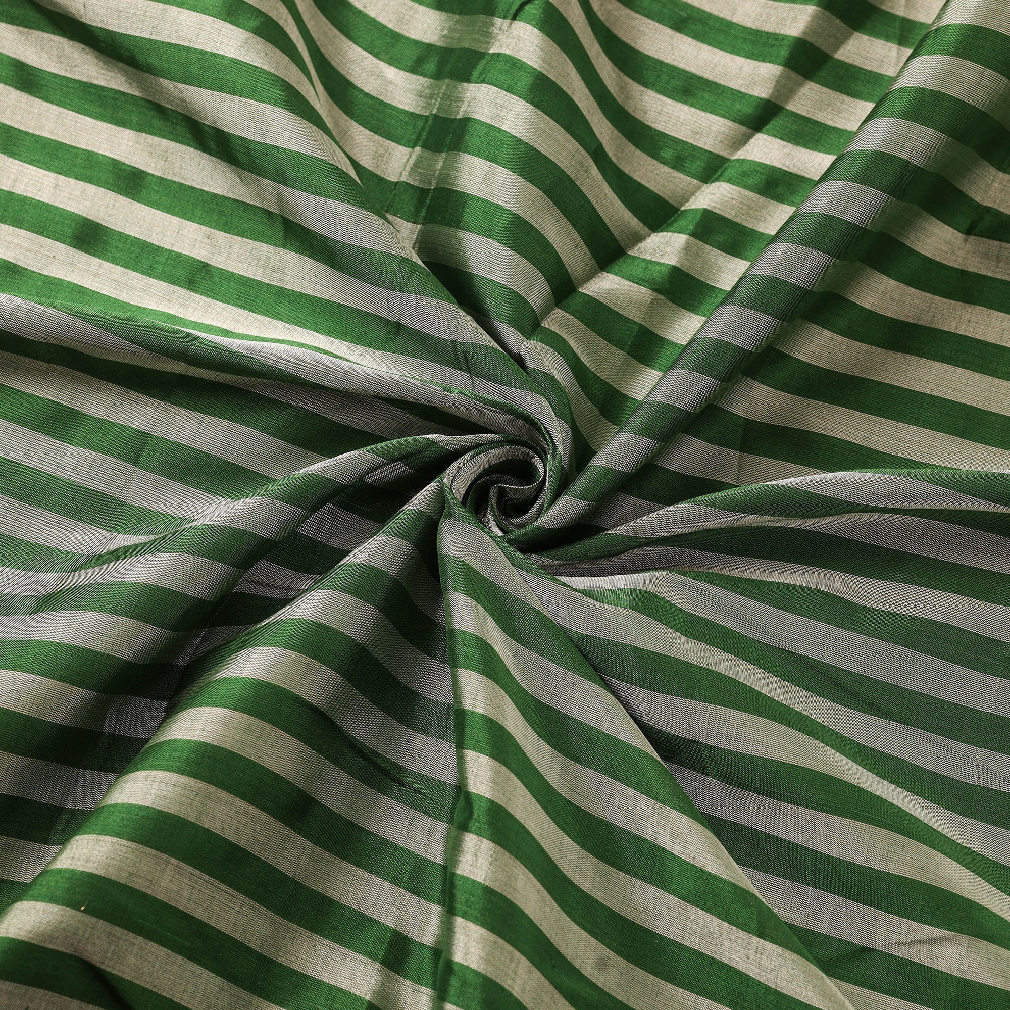 Green pure handloom full tissue silver zari stripes chanderi fabric is woven by master artisan Rauph Khan from Madhya Pradesh. Originating from the historic town of Chanderi, this weave is known for its lightweight texture and sheer elegance. Handloom weaving in chanderi combines silk and mercerised cotton threads to create a fabric that feels airy yet refined. Perfect for crafting kurtas, dresses, blouses, skirts, dupattas, curtains, cushion covers and more.