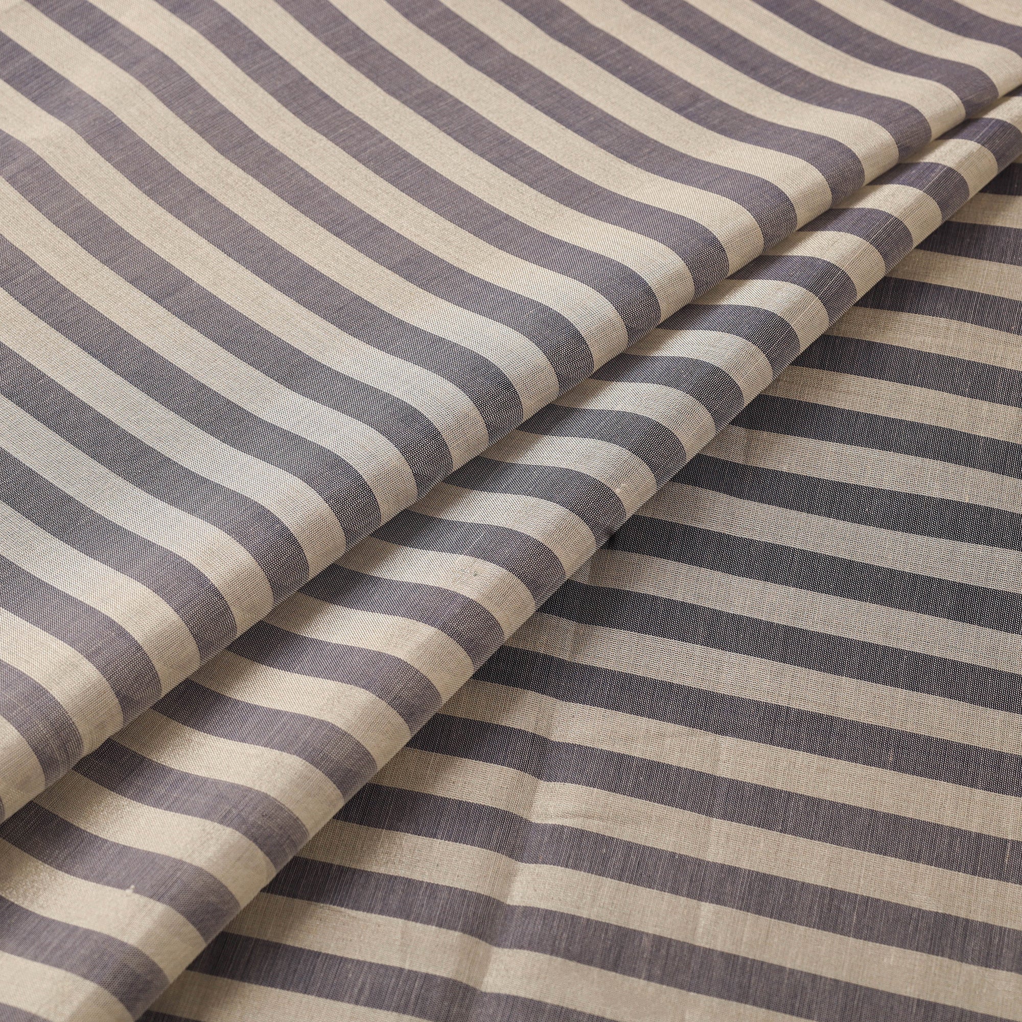 Beige pure handloom full tissue silver zari stripes chanderi fabric is woven by master artisan Rauph Khan from Madhya Pradesh. Originating from the historic town of Chanderi, this weave is known for its lightweight texture and sheer elegance. Handloom weaving in chanderi combines silk and mercerised cotton threads to create a fabric that feels airy yet refined. Perfect for crafting kurtas, dresses, blouses, skirts, dupattas, curtains, cushion covers and more.