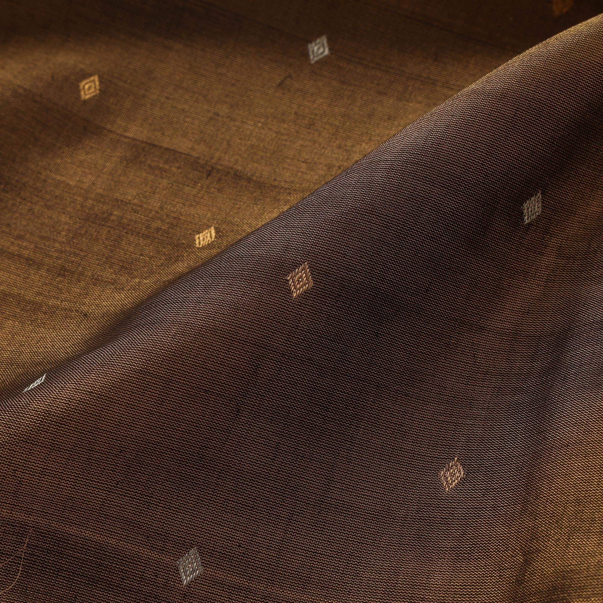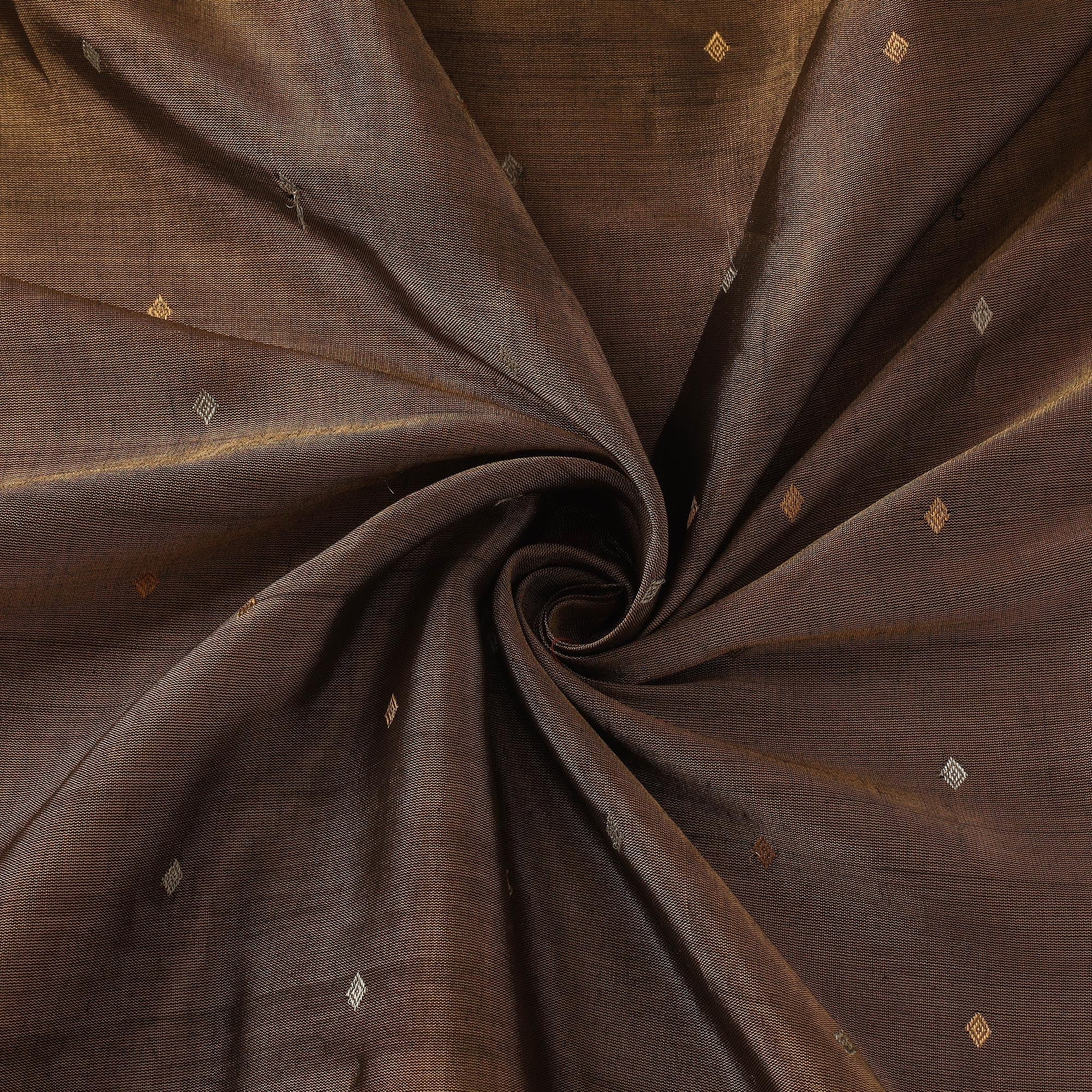 Brown handloom heavy tissue gold zari pure chanderi silk buti fabric woven by master artisan Sagir Ahmed from Madhya Pradesh. Originating from the historic town of chanderi this weave is known for lightweight texture and sheer elegance.