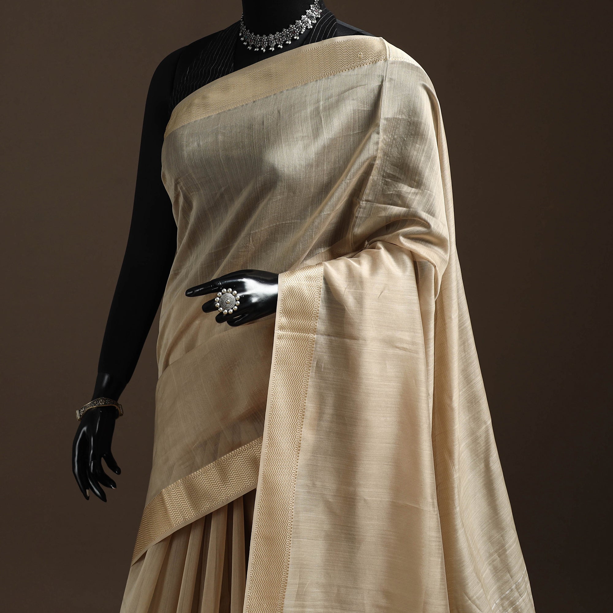 Beige maheshwari handloom saree with zari border is woven by artisans in Maheshwar, Madhya Pradesh, using traditional weaving techniques. It uses organza silk 2/130 denial in the warp and mercerised cotton 2/120 in the weft, which gives the saree a comfortable feel and a light sheen. Suitable for both everyday wear and celebrations.