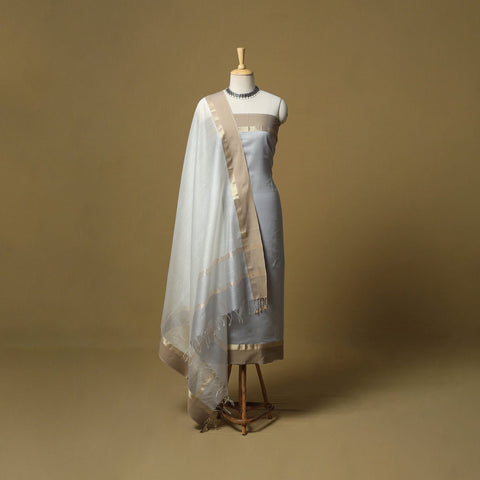 Grey handloom maheshwari silk cotton unstitched 2pc dress material from Madhya Pradesh, showcasing the intricate craftsmanship of Maheshwari weaving, features kurta fabric paired with a dupatta finished with tassels. The zari and resham border add a refined touch to the design. The fabric is light easy to drape and works well for festive wear small celebrations or everyday elegant styling.