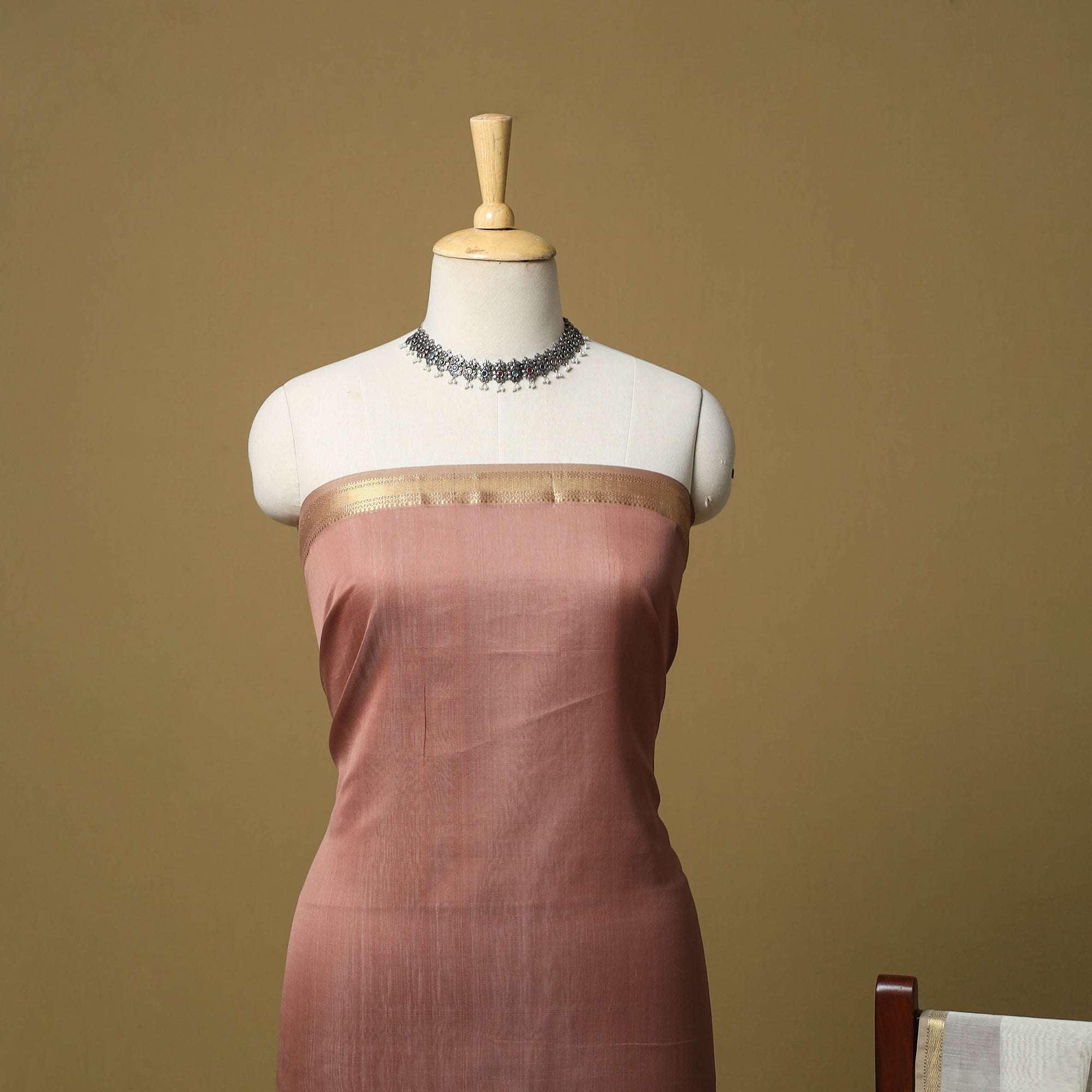 Pink handloom maheshwari silk cotton unstitched 2pc dress material from Madhya Pradesh, showcasing the intricate craftsmanship of Maheshwari weaving, features kurta fabric paired with a dupatta finished with tassels. The zari border add a refined touch to the design. The fabric is light, easy to drape and works well for festive wear, small celebrations or everyday elegant styling.