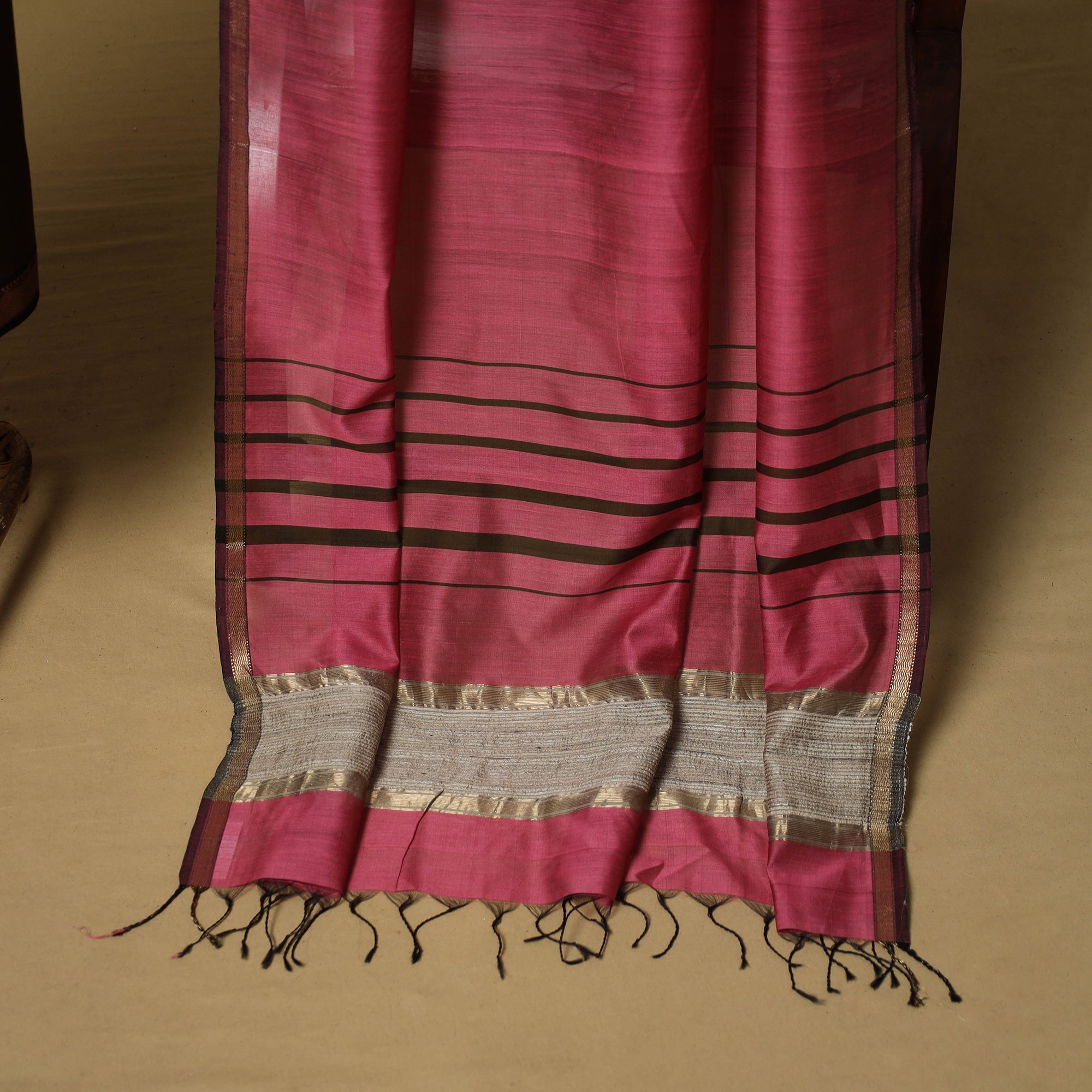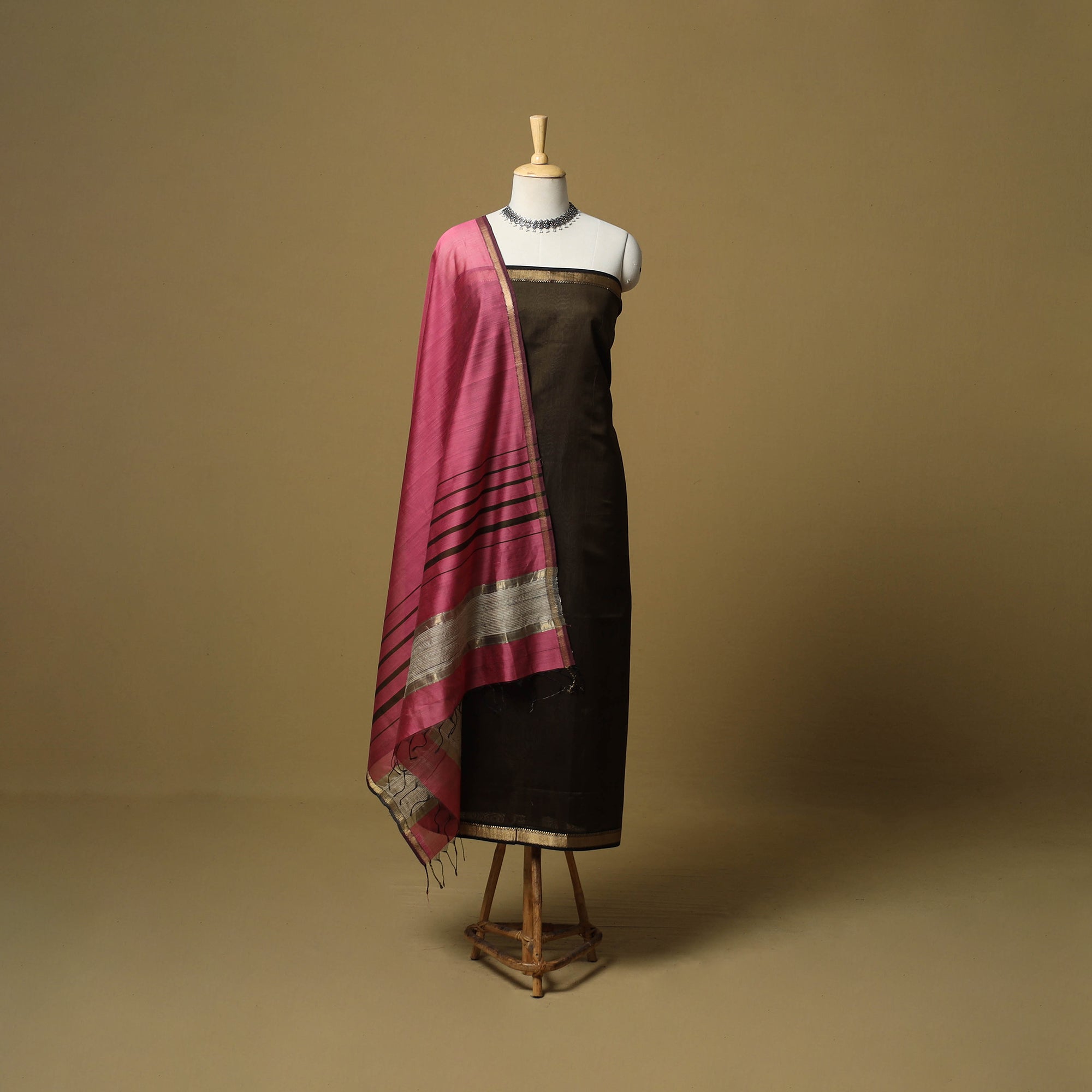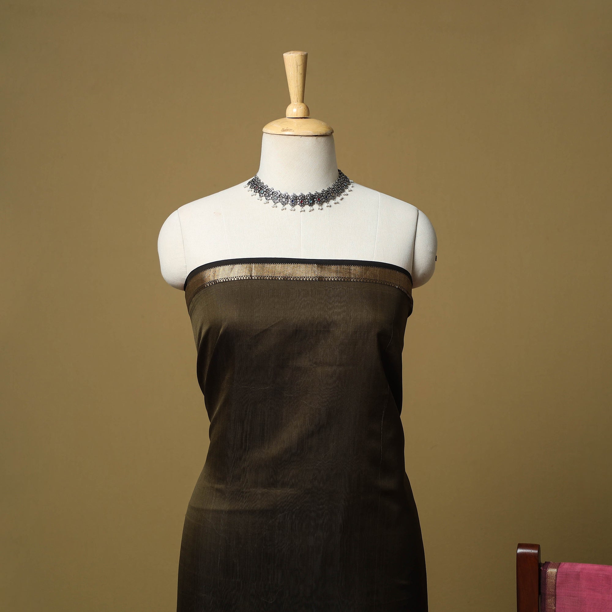 Brown handloom maheshwari silk cotton unstitched 2pc dress material from Madhya Pradesh, showcasing the intricate craftsmanship of Maheshwari weaving, features kurta fabric paired with a dupatta finished with tassels. The zari border add a refined touch to the design. The fabric is light, easy to drape and works well for festive wear, small celebrations or everyday elegant styling.