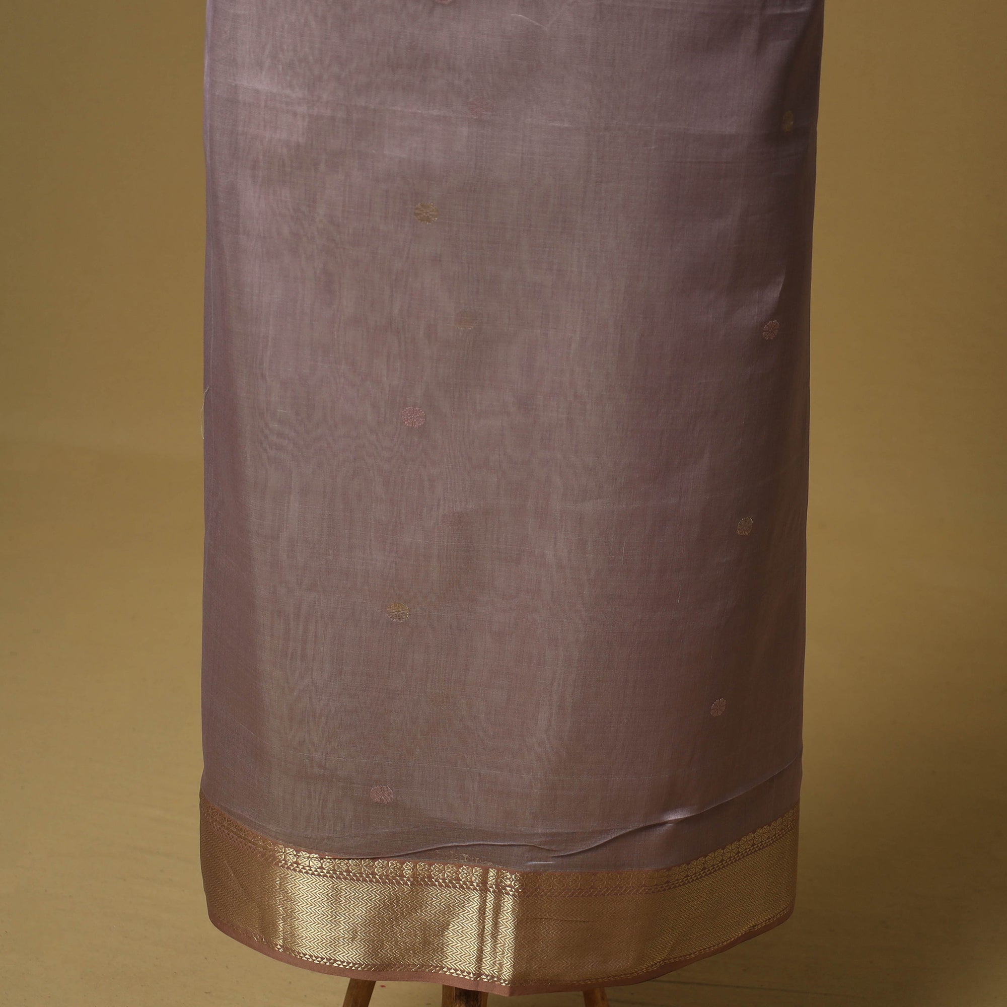 Pink handloom maheshwari silk cotton unstitched 2pc dress material from Madhya Pradesh, showcasing the intricate craftsmanship of Maheshwari weaving features kurta fabric paired with a dupatta finished with tassels. The subtle buti detailing and the zari border add a refined touch to the design. The fabric is light easy to drape and works well for festive wear, small celebrations or everyday elegant styling.