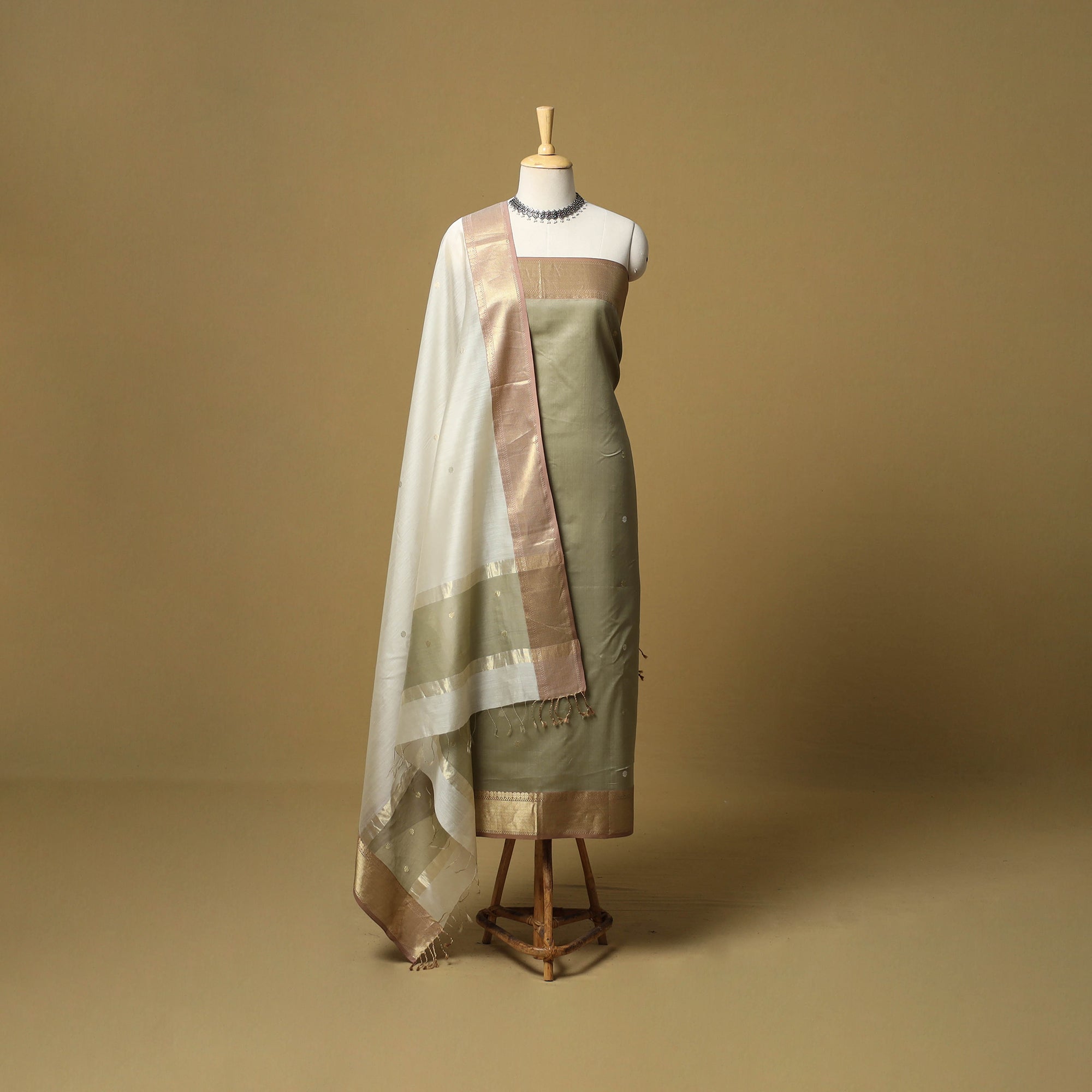Handloom maheshwari silk cotton unstitched 2pc dress material from Madhya Pradesh, showcasing the intricate craftsmanship of Maheshwari weaving features kurta fabric paired with a dupatta finished with tassels. The subtle buti detailing and the zari border add a refined touch to the design. The fabric is light easy to drape and works well for festive wear, small celebrations or everyday elegant styling.