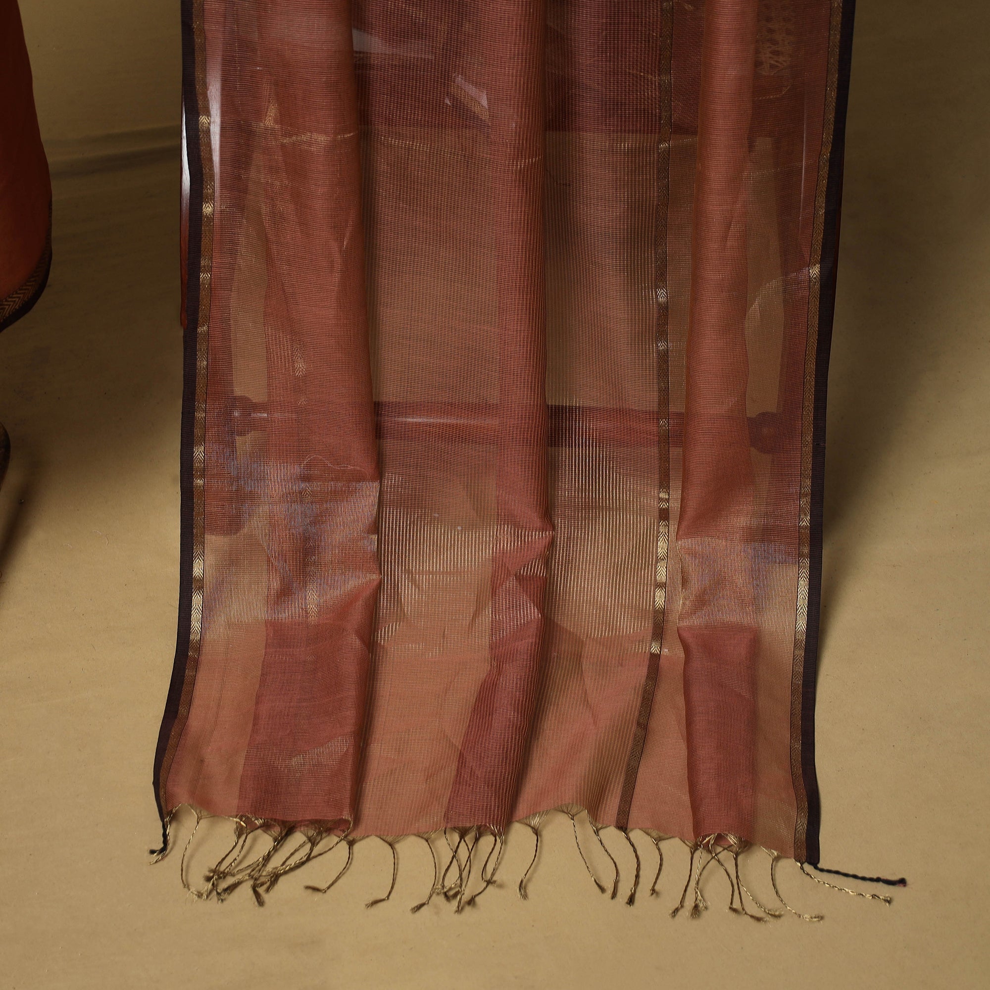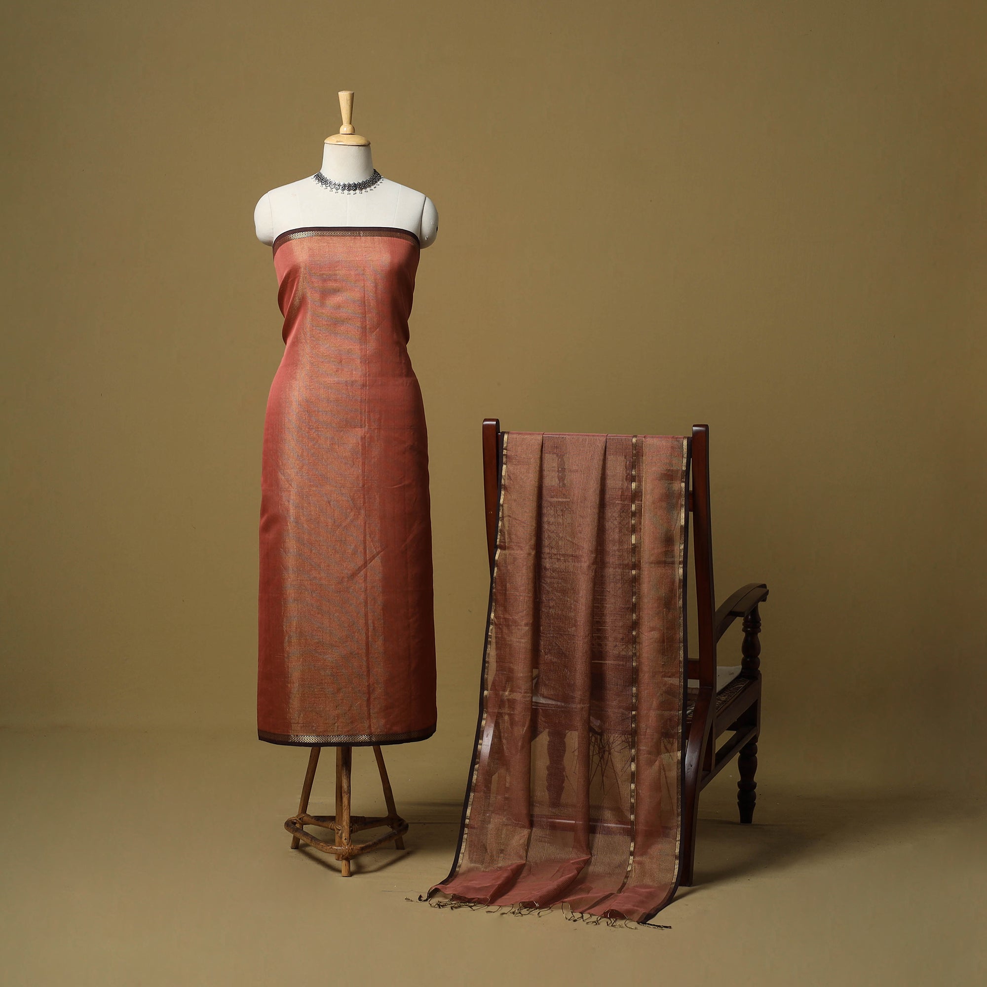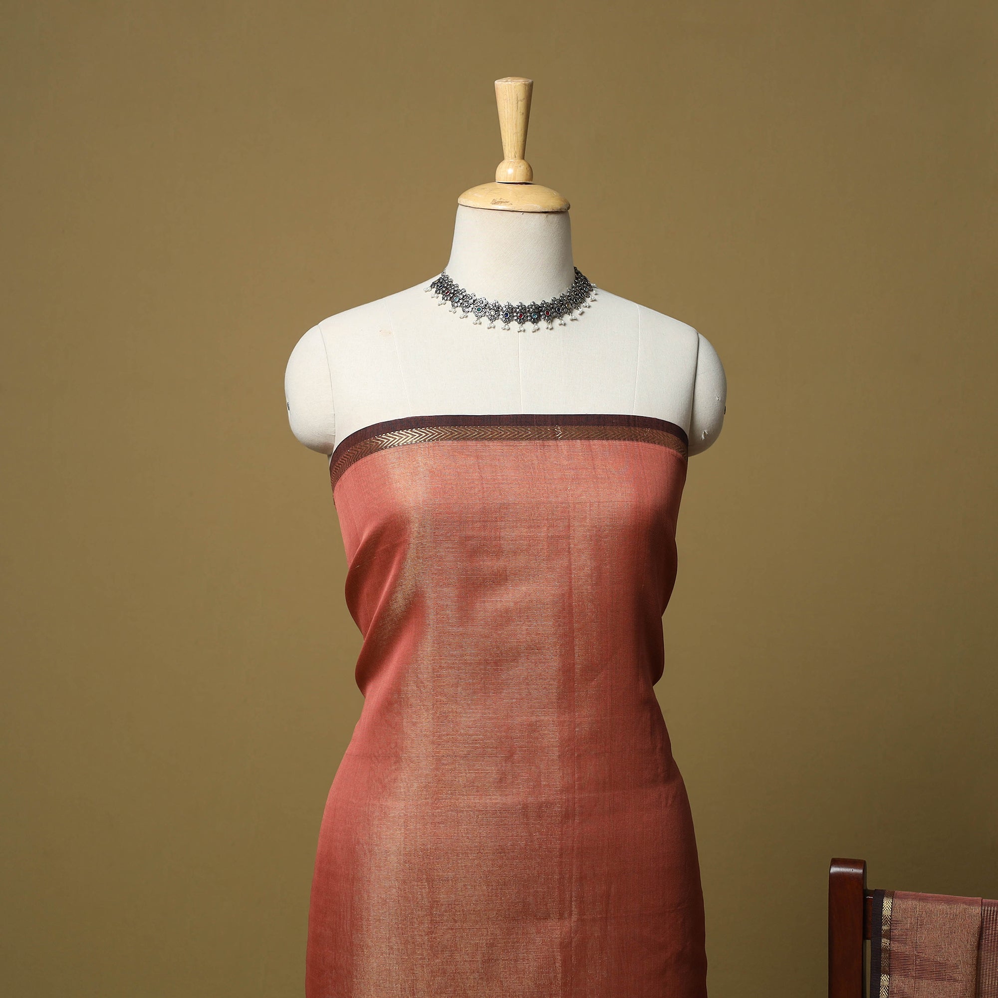 Pink handloom maheshwari silk cotton tissue zari unstitched 2pc dress material from Madhya Pradesh showcases the intricate detailing of Maheshwari weaving. The set includes kurta fabric and a dupatta finished with tassels. The tissue zari known for its subtle sheen and fine woven texture, enhances the fabric’s appearance while the zari border adds a refined touch to the design. The fabric is light easy to drape and suitable for festive wear, small celebrations or everyday elegant styling.