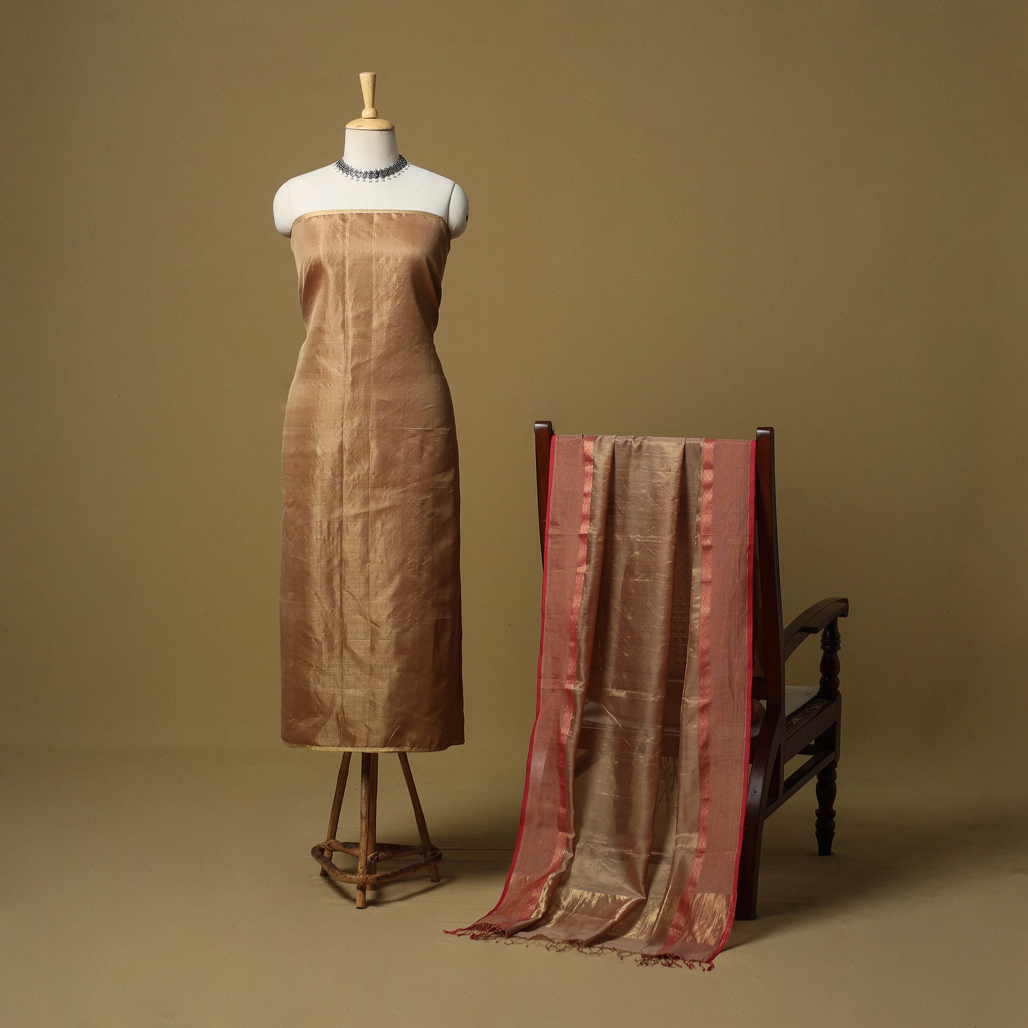 Brown handloom maheshwari silk cotton tissue zari unstitched 2pc dress material from Madhya Pradesh showcases the intricate detailing of Maheshwari weaving. The set includes kurta fabric and a dupatta finished with tassels. The tissue zari known for its subtle sheen and fine woven texture, enhances the fabric’s appearance while the zari border adds a refined touch to the design. The fabric is light easy to drape and suitable for festive wear, small celebrations or everyday elegant styling.