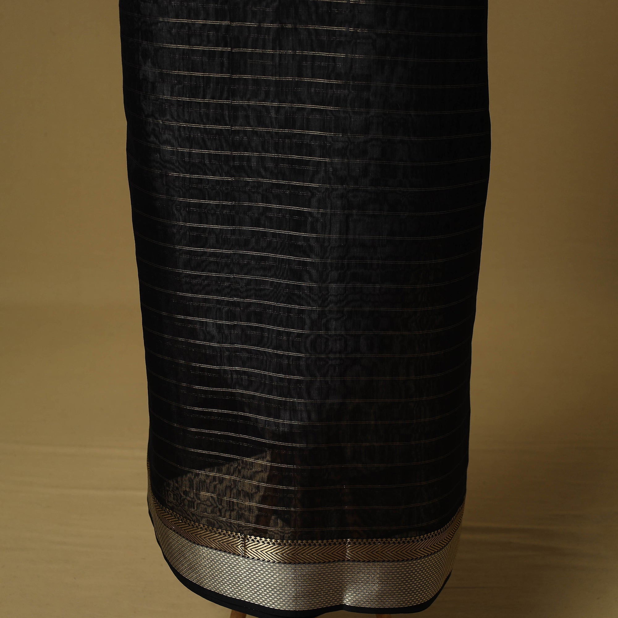 Black handloom maheshwari silk cotton tissue zari stripes unstitched 2pc dress material from Madhya Pradesh, showcasing the intricate craftsmanship of Maheshwari weaving, features kurta fabric paired with a dupatta finished with tassels. The zari and resham border add a refined touch to the design. The fabric is light, easy to drape and works well for festive wear small celebrations or everyday elegant styling.