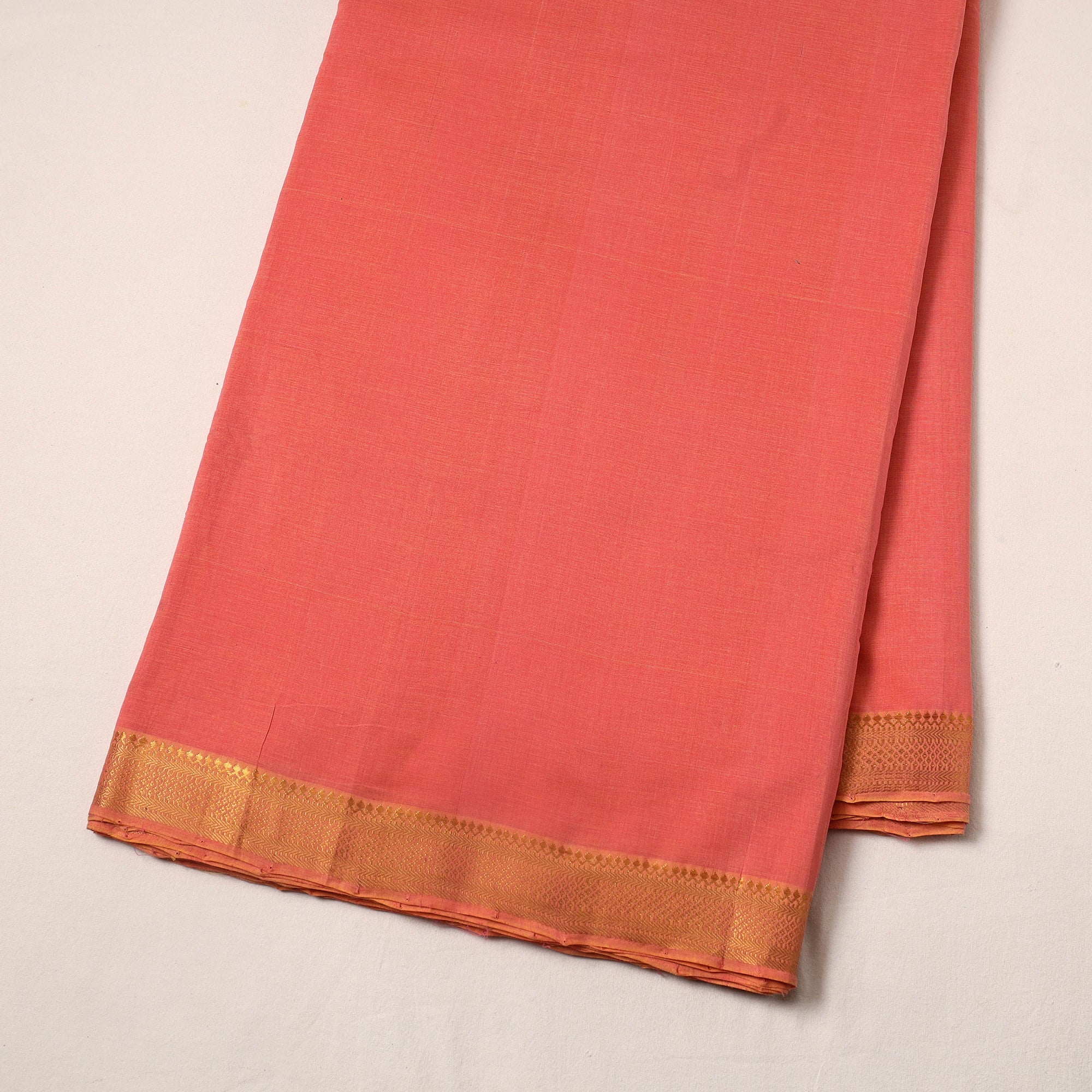 Handloom original peach mangalagiri cotton fabric with zari border, woven with precision by skilled artisans in Andhra Pradesh. This fabric features a two-sided zari border. Known for its durability, breathability, and soft texture, this eco-friendly fabric is perfect for all seasons. It adds grace to every stitch, perfect for kurtas, dupattas, or ethnic wear.