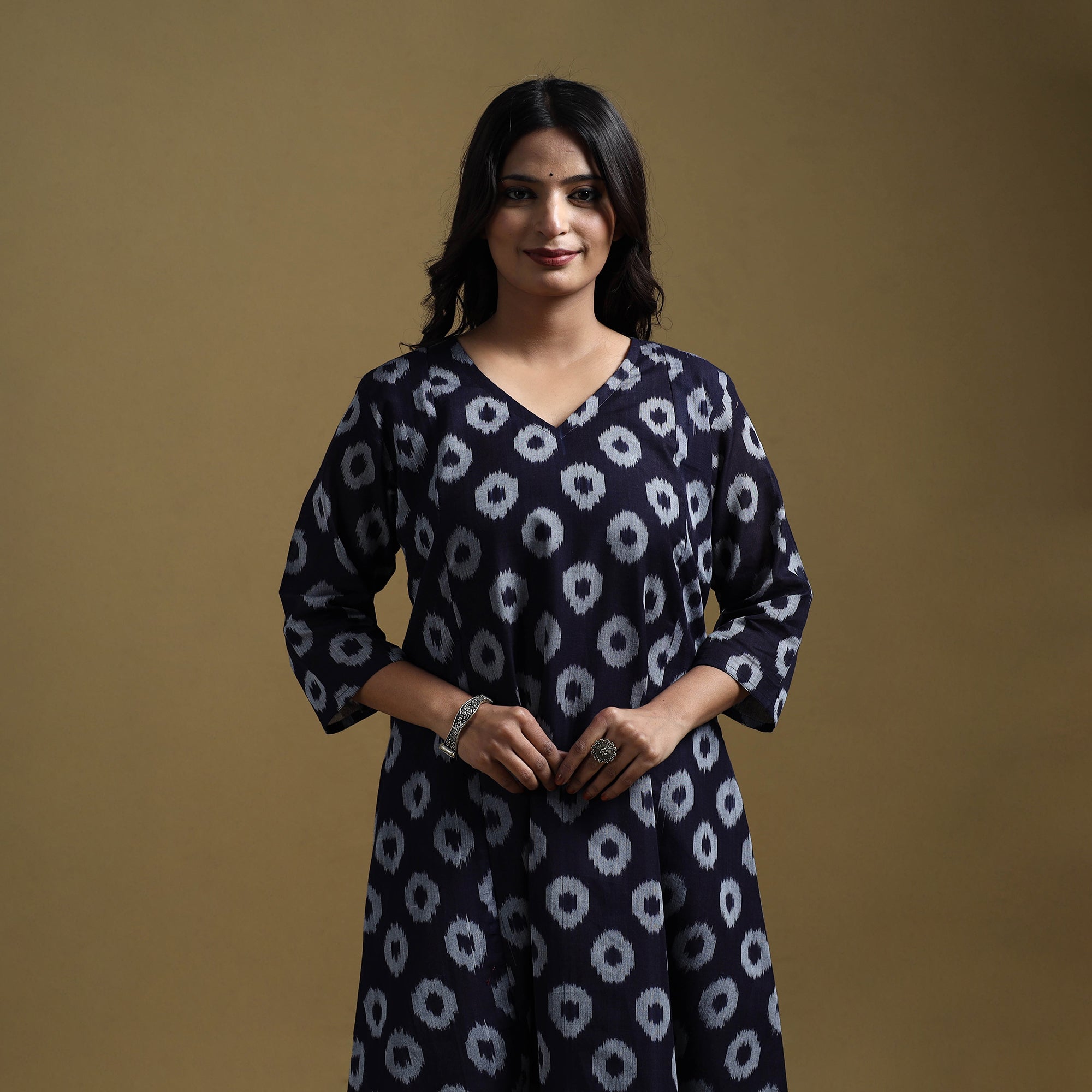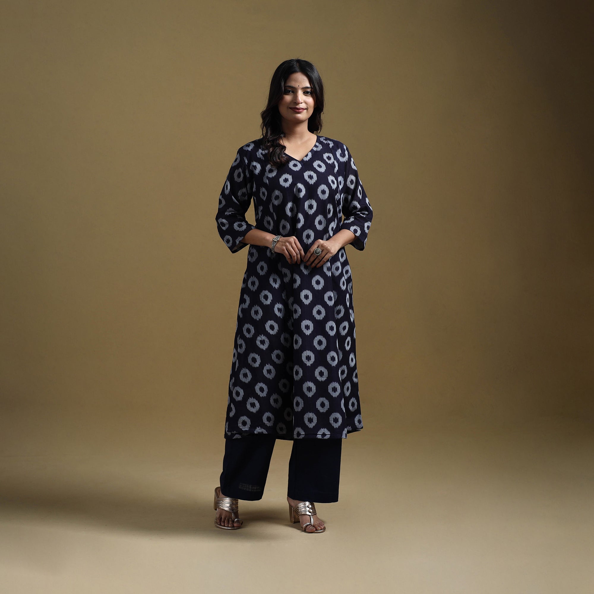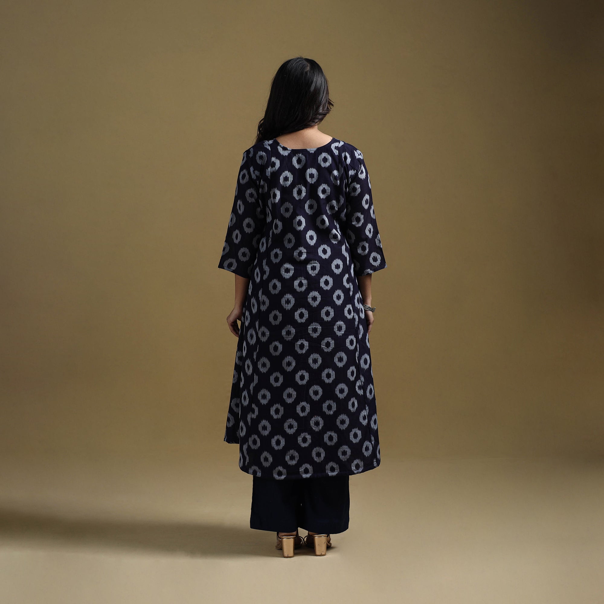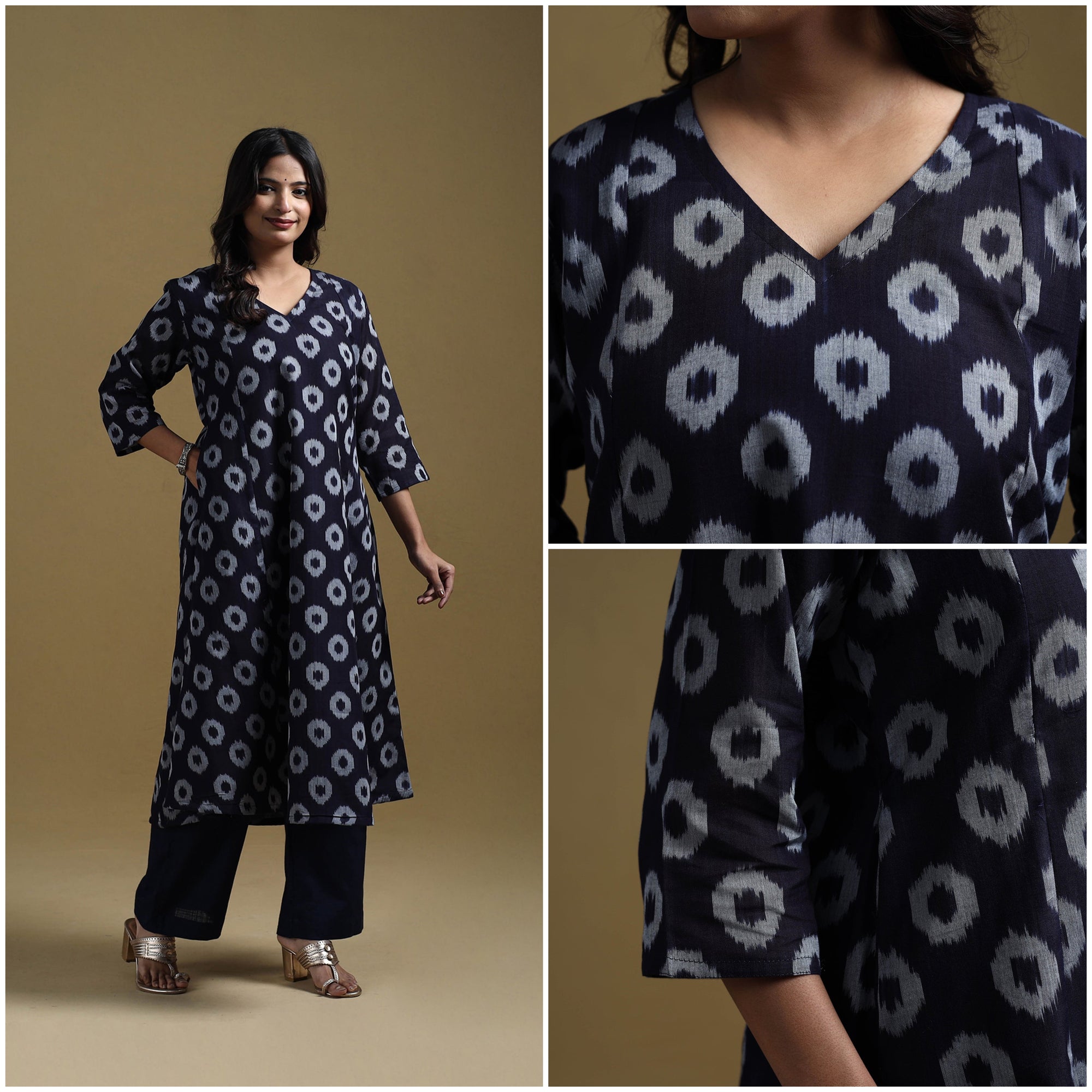 Pochampally ikat kurta set crafted from mercerised cotton, showcasing the traditional weave of Telangana. The geometric patterns are formed using a resist-dyeing technique where yarns are dyed before weaving, creating precise, vibrant motifs. The a-line kurta features a side pocket, paired with slub cotton plain palazzo with two side pockets and an elasticated waist for ease of movement. Suitable for office wear, casual outings and everyday comfort.