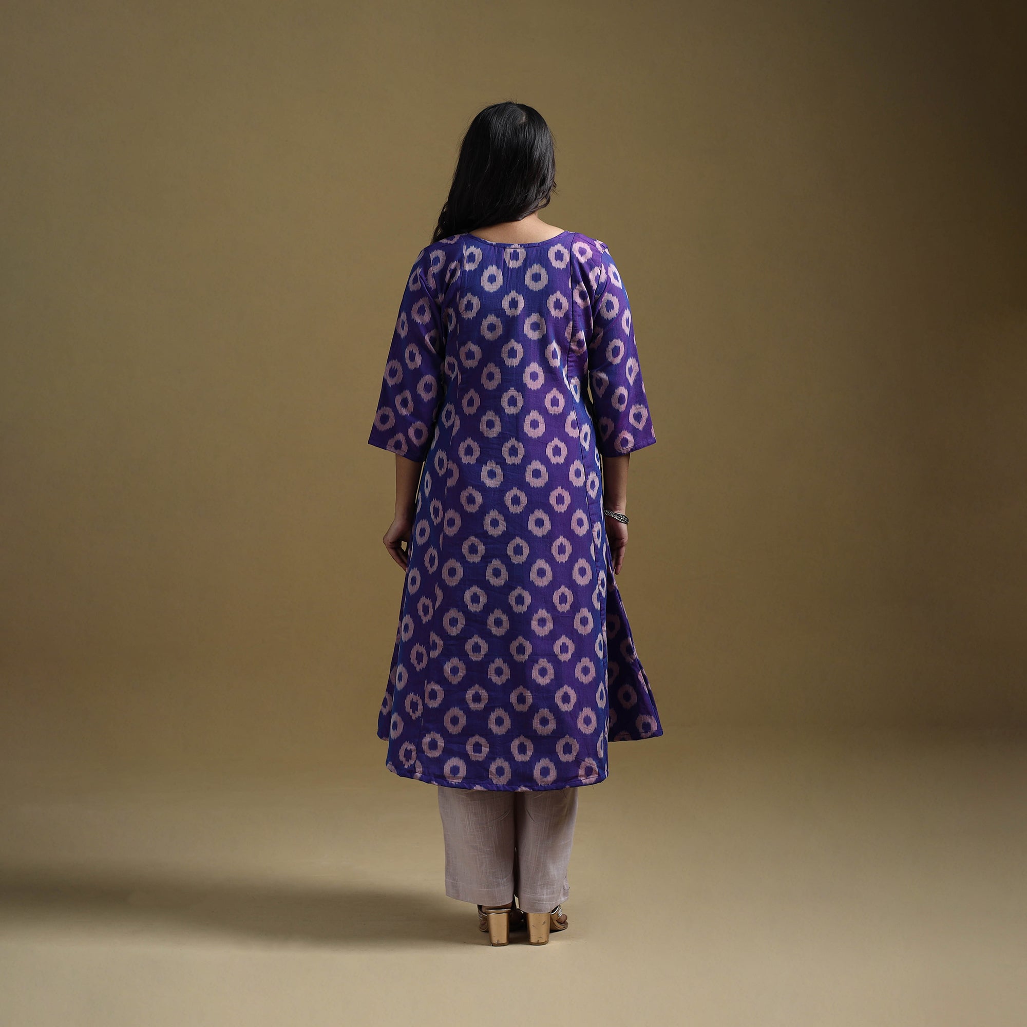 Pochampally ikat kurta set crafted from mercerised cotton, showcasing the traditional weave of Telangana. The geometric patterns are formed using a resist-dyeing technique where yarns are dyed before weaving, creating precise, vibrant motifs. The a-line kurta features a side pocket, paired with slub cotton plain palazzo with two side pockets and an elasticated waist for ease of movement. Suitable for office wear, casual outings and everyday comfort.