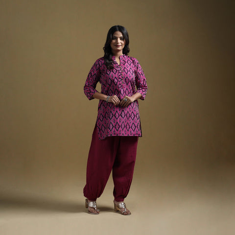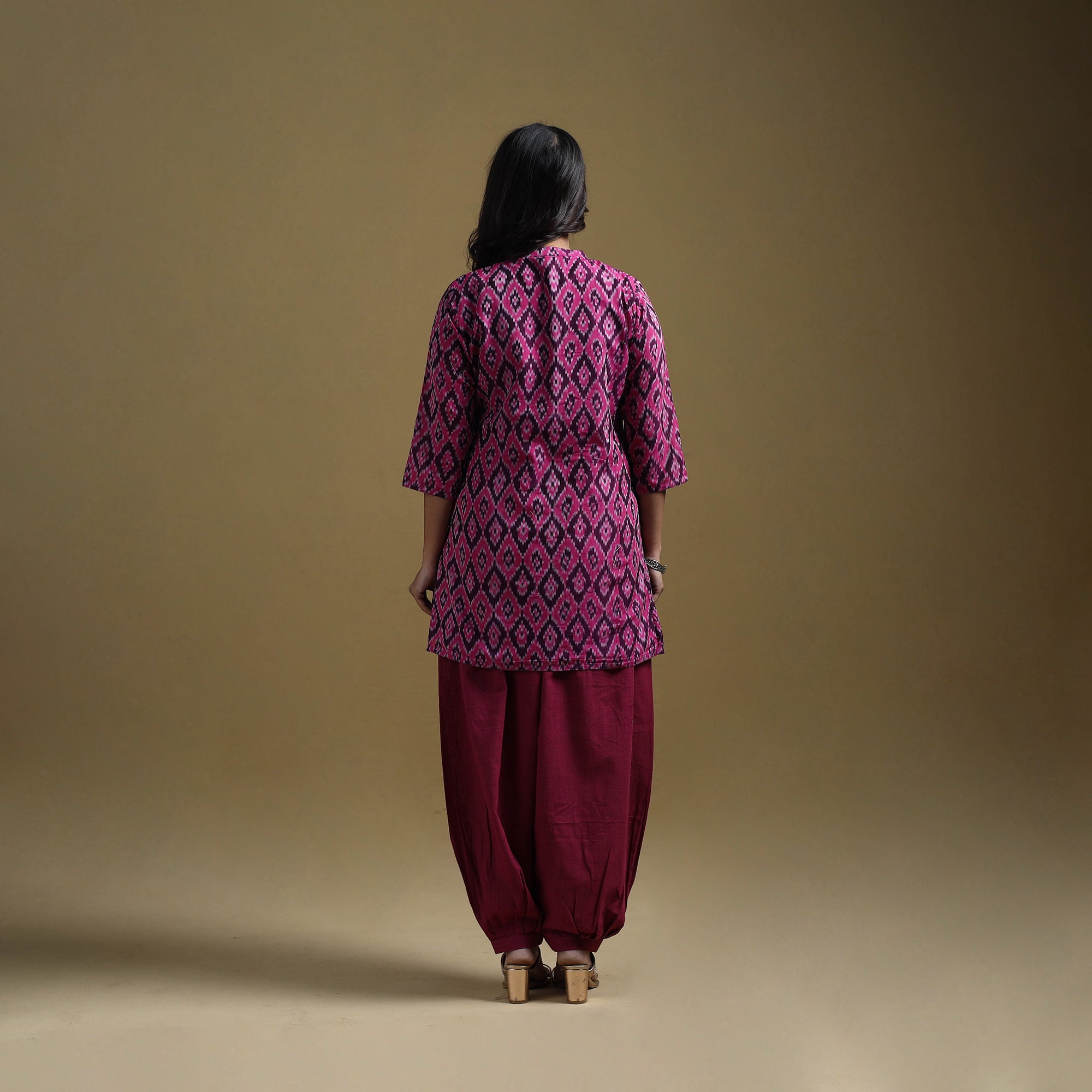 Pochampally ikat kurta set crafted from mercerised cotton, reflecting the traditional weave of Telangana. The geometric patterns are created using a resist-dyeing technique where yarns are dyed before weaving, resulting in precise, vibrant motifs. The short kurta is paired with an slub cotton plain afghani salwar featuring an elasticated waist for ease of movement. Suitable for office wear, casual outings and everyday comfort.