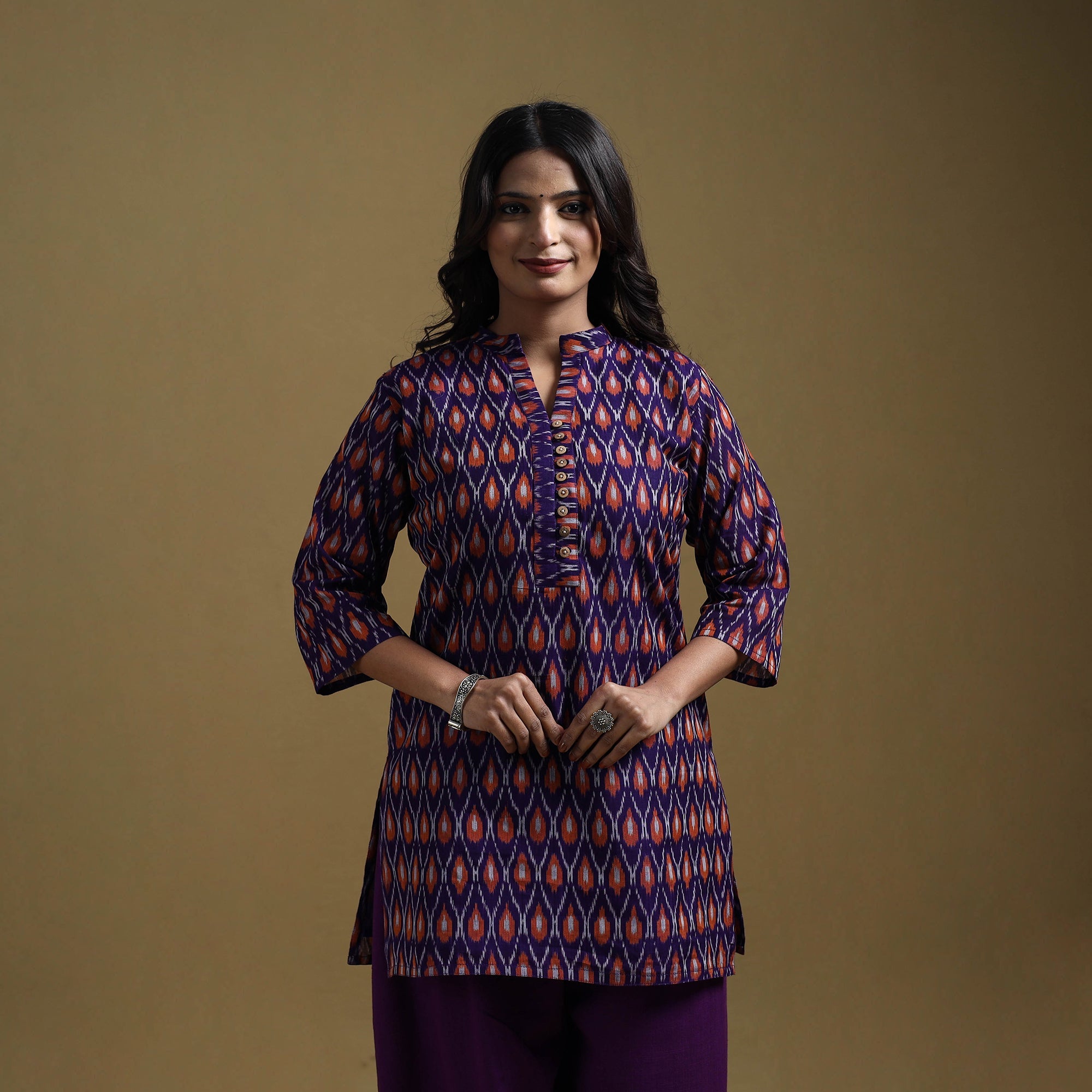 Pochampally ikat kurta set crafted from mercerised cotton, reflecting the traditional weave of Telangana. The geometric patterns are created using a resist-dyeing technique where yarns are dyed before weaving, resulting in precise, vibrant motifs. The short kurta is paired with an slub cotton plain afghani salwar featuring an elasticated waist for ease of movement. Suitable for office wear, casual outings and everyday comfort.