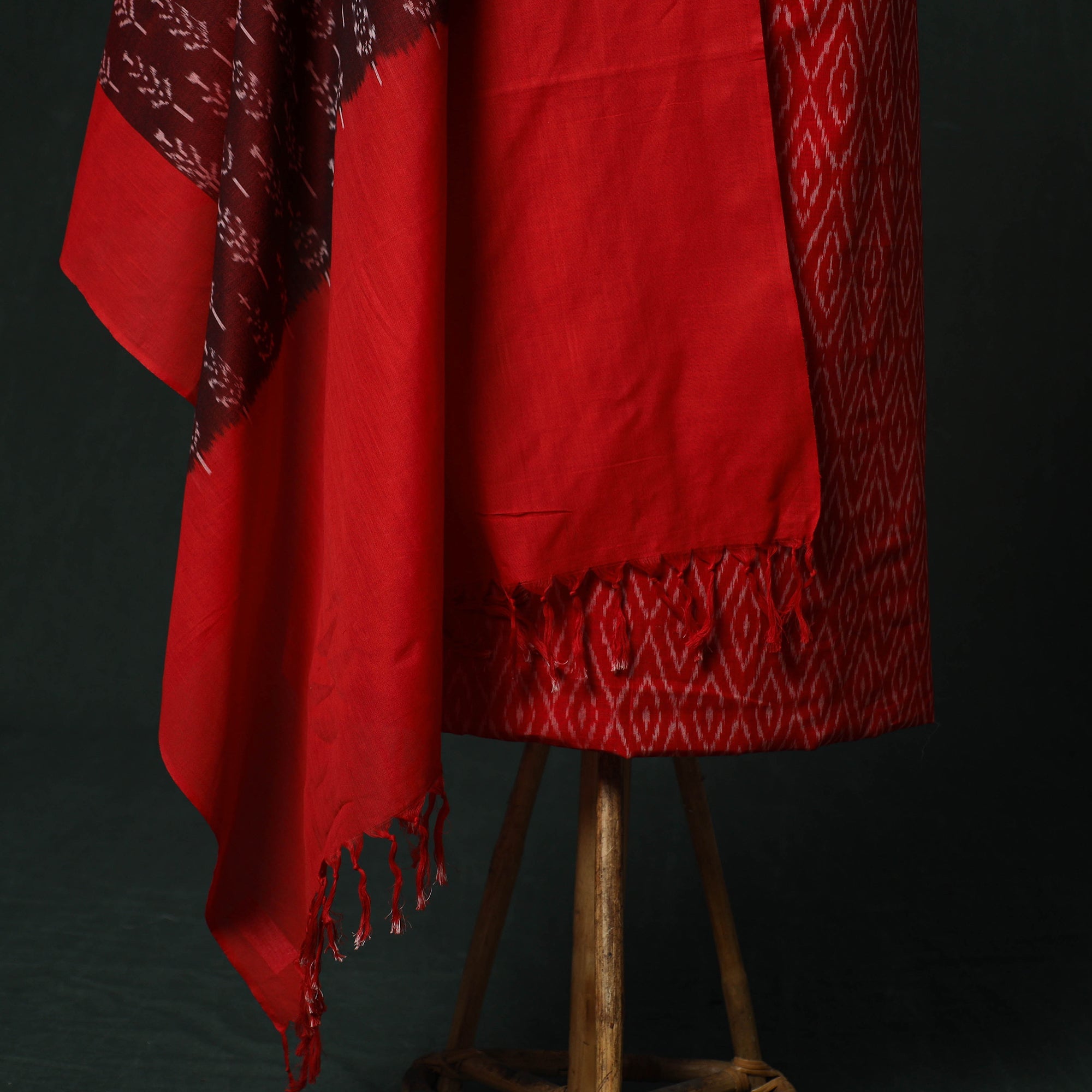 Handloom pochampally ikat mercerised cotton 2pc unstitched dress material is woven by skilled weavers from Telangana using a resist-dye technique that is thousands of years old. Each thread is dyed before weaving to create the signature intricate Ikat patterns, the set includes kurta fabric with a matching dupatta, offering a graceful drape and making it ideal for tailoring elegant ethnic wear.