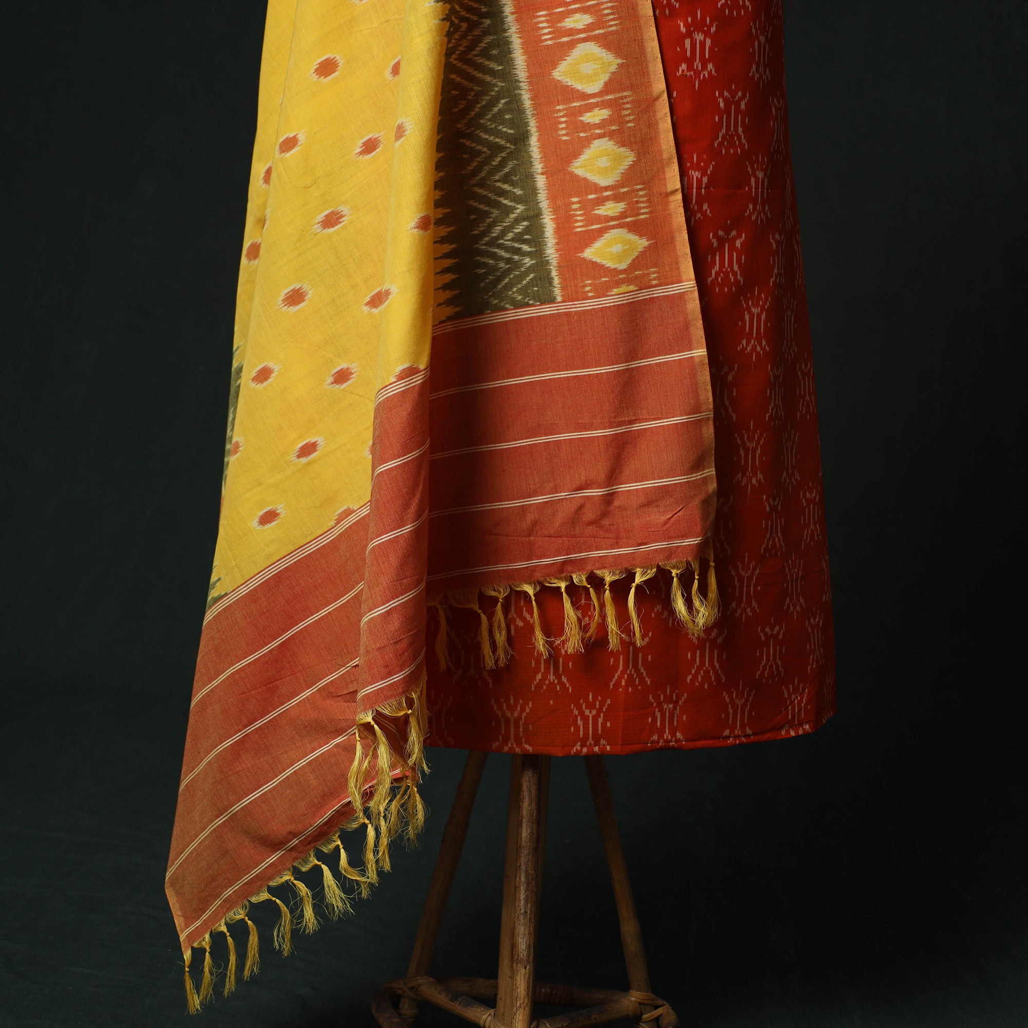 Handloom pochampally ikat mercerised cotton 2pc unstitched dress material is woven by skilled weavers from Telangana using a resist-dye technique that is thousands of years old. Each thread is dyed before weaving to create the signature intricate Ikat patterns, the set includes kurta fabric with a matching dupatta, offering a graceful drape and making it ideal for tailoring elegant ethnic wear.