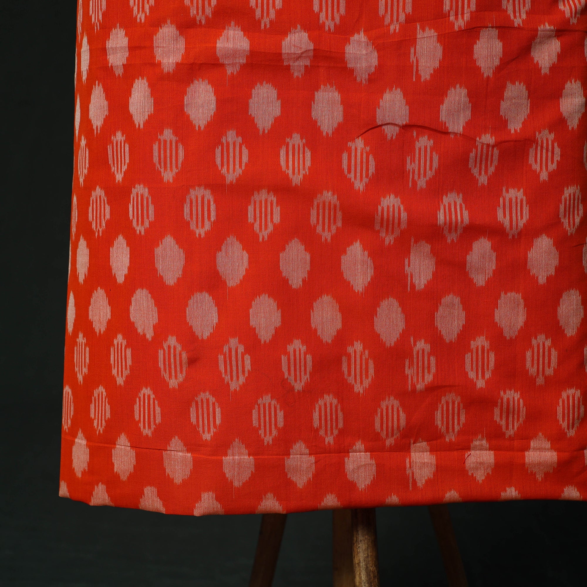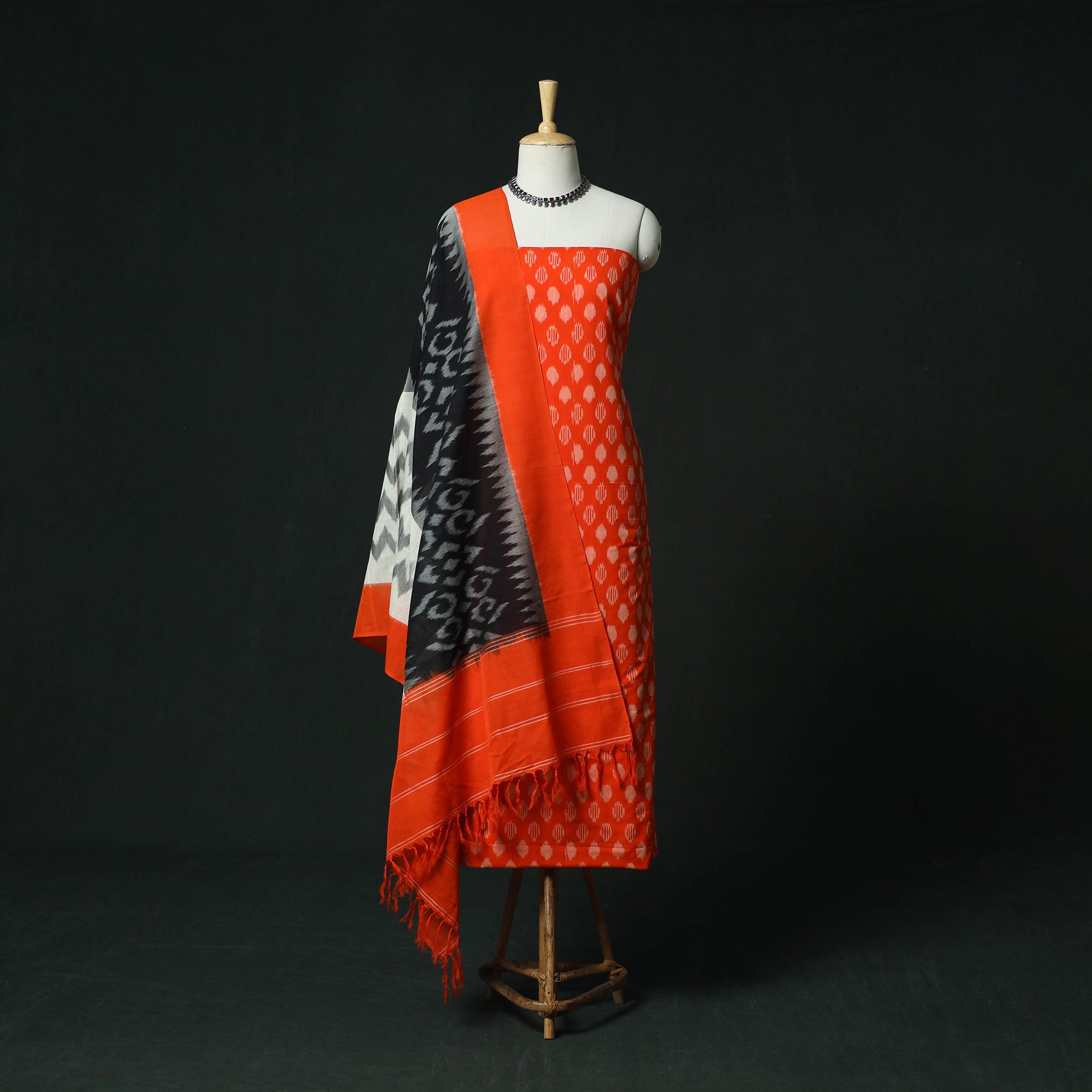 Handloom pochampally ikat mercerised cotton 2pc unstitched dress material is woven by skilled weavers from Telangana using a resist-dye technique that is thousands of years old. Each thread is dyed before weaving to create the signature intricate Ikat patterns, the set includes kurta fabric with a matching dupatta, offering a graceful drape and making it ideal for tailoring elegant ethnic wear.