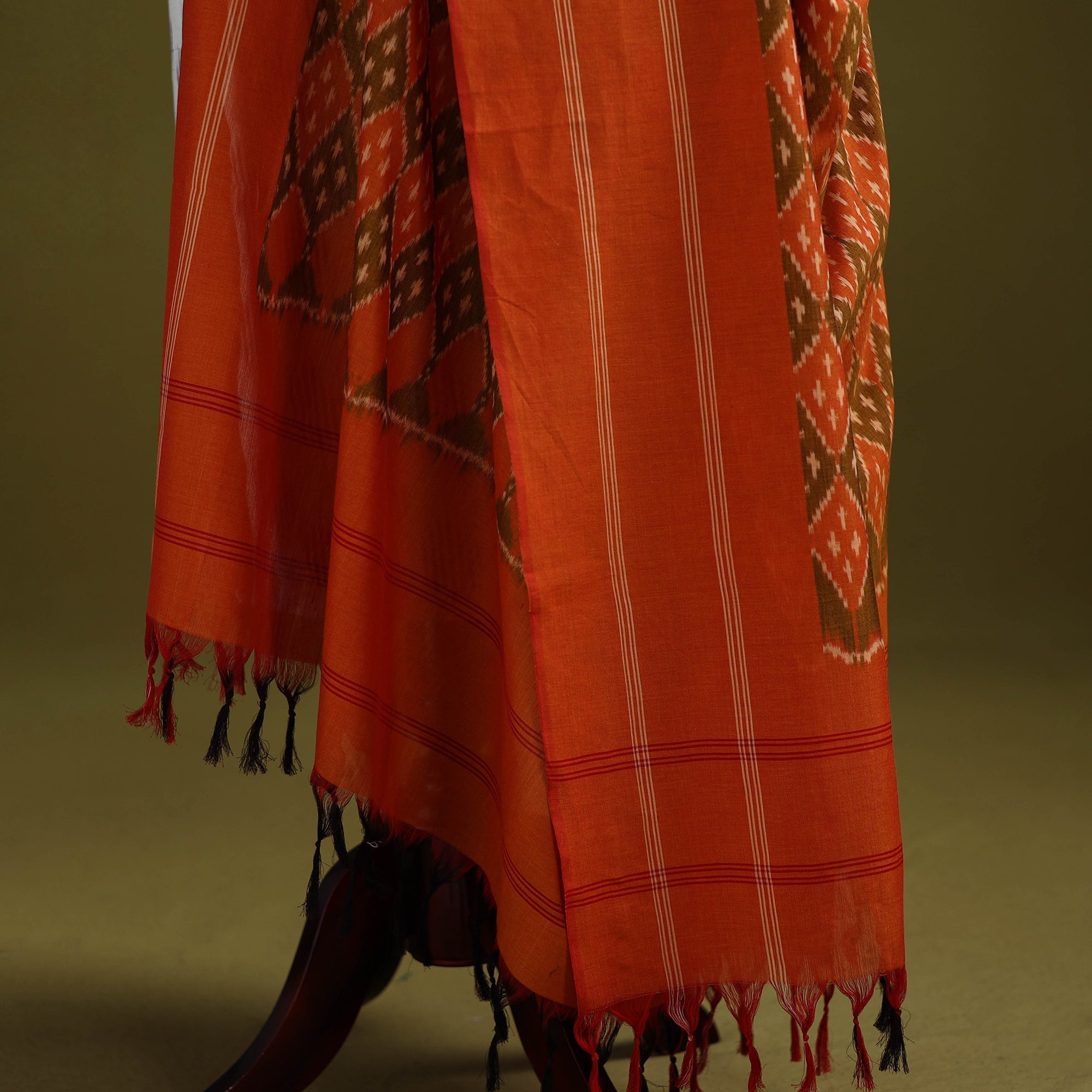 | Material | Orange handloom pochampally ikat mercerised cotton dupatta with tassels, woven by skilled artisans in Telangana. Made using the thousands-of-years-old Ikat resist-dye technique, also known as Ikkat, where the warp and weft yarns are dyed before weaving. Celebrated for its intricate motifs and textured appeal, this dupatta is perfect for occasions, casual outings or adding a touch of elegance to everyday wear. |