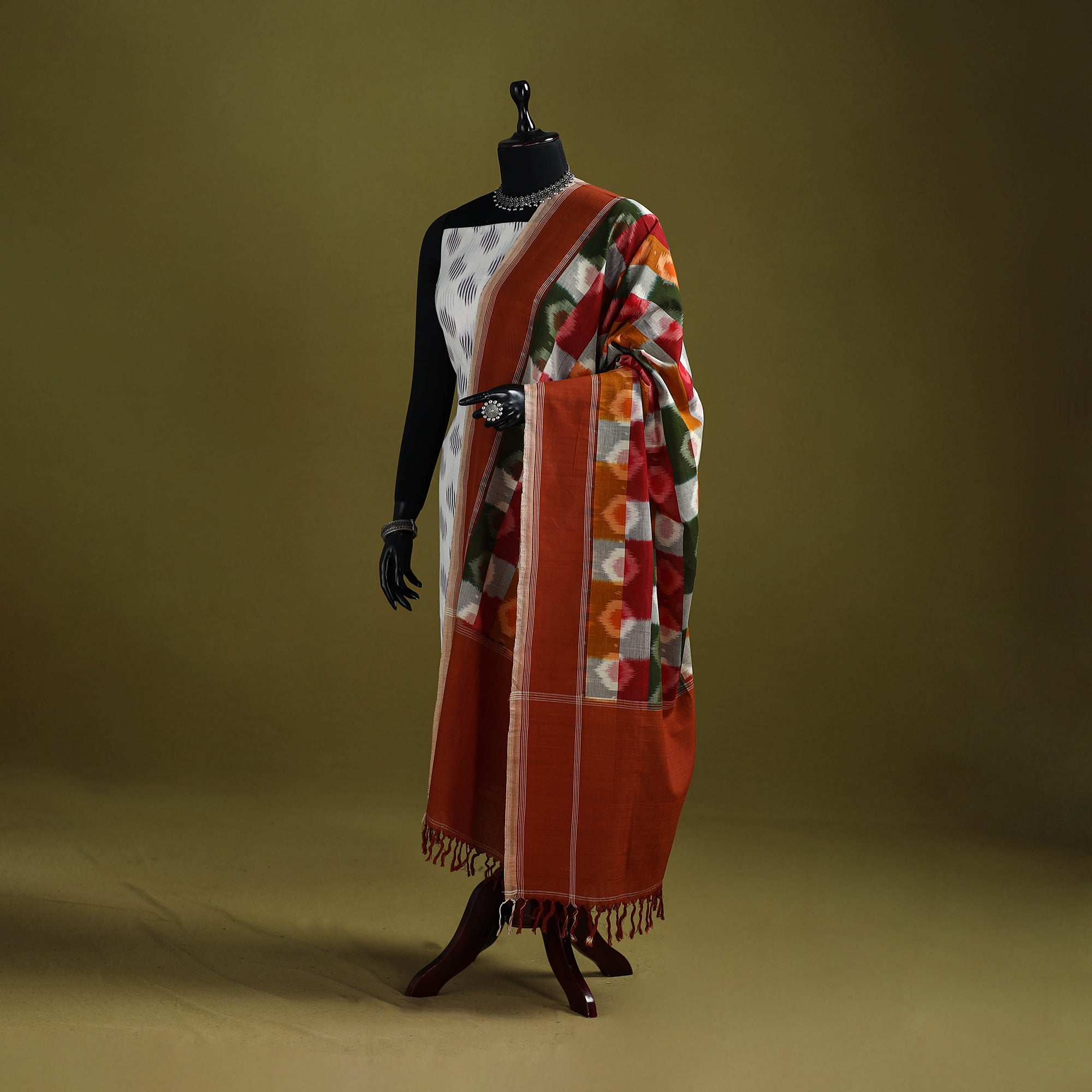 Handloom pochampally ikat mercerised cotton dupatta with tassels, woven by skilled artisans in Telangana. Made using the thousands-of-years-old Ikat resist-dye technique, also known as Ikkat, where the warp and weft yarns are dyed before weaving. Celebrated for its intricate motifs and textured appeal, this dupatta is perfect for occasions, casual outings or adding a touch of elegance to everyday wear.