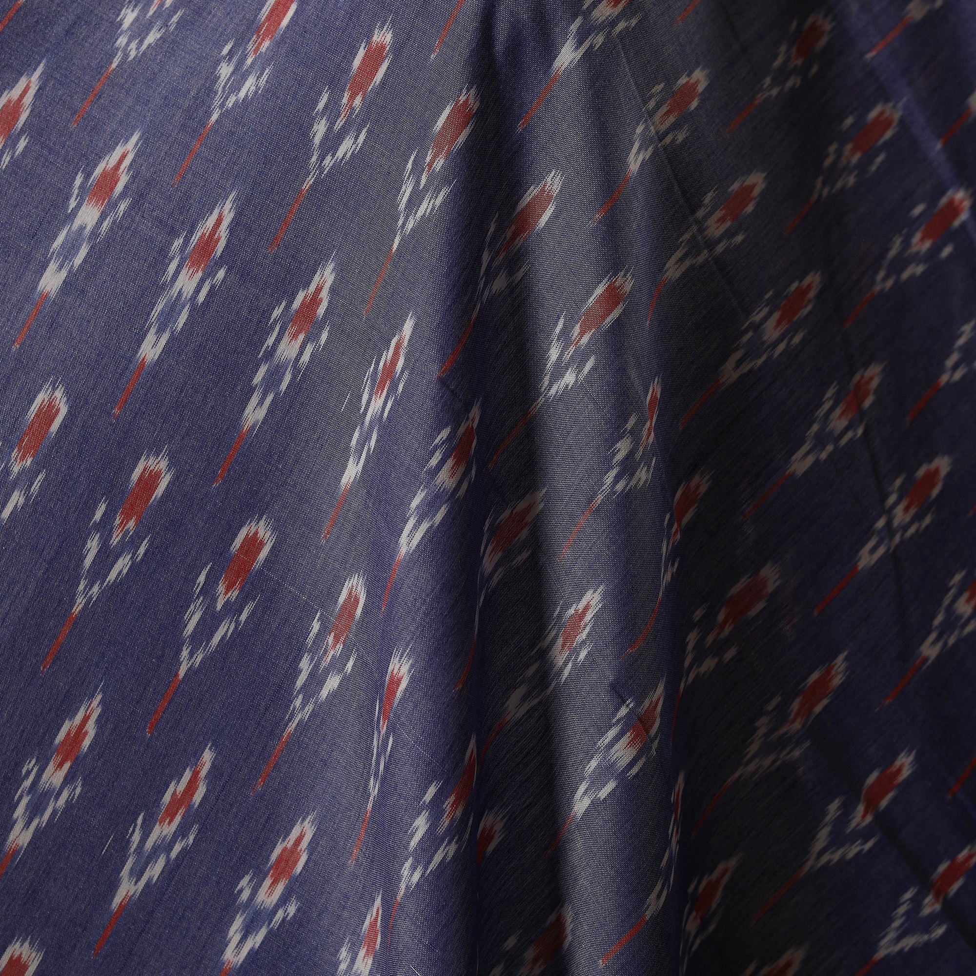 Blue handloom mercerised cotton pochampally ikat fabric from Telangana features vibrant geometric patterns created through a resist-dyeing technique where threads are dyed before weaving. Known for its smooth texture and refined finish, this durable fabric is perfect for clothing and decor, adding a touch of traditional elegance and artisanal charm to every creation.