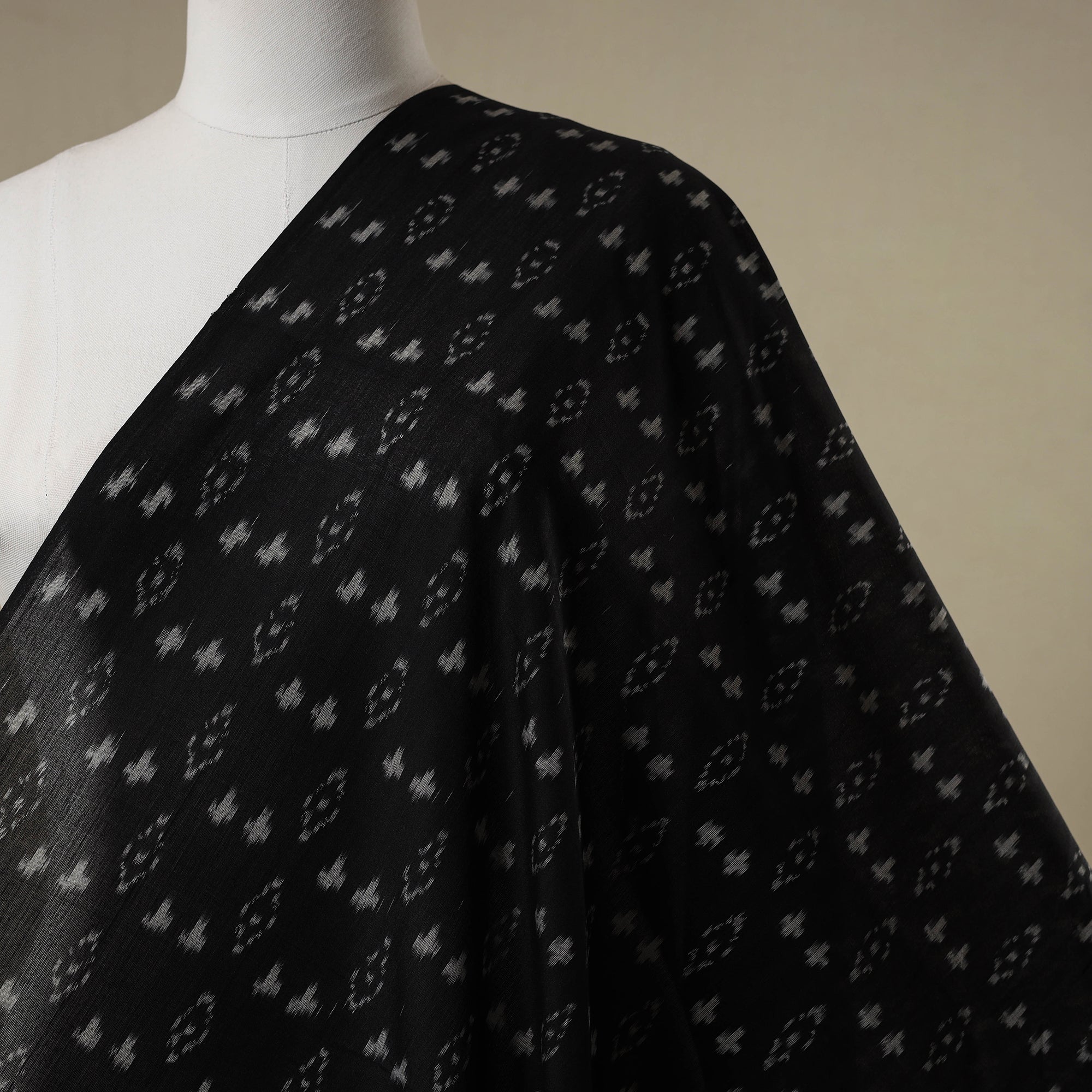 Black handloom mercerised cotton pochampally ikat fabric from Telangana features vibrant geometric patterns created through a resist-dyeing technique where threads are dyed before weaving. Known for its smooth texture and refined finish, this durable fabric is perfect for clothing and decor, adding a touch of traditional elegance and artisanal charm to every creation.