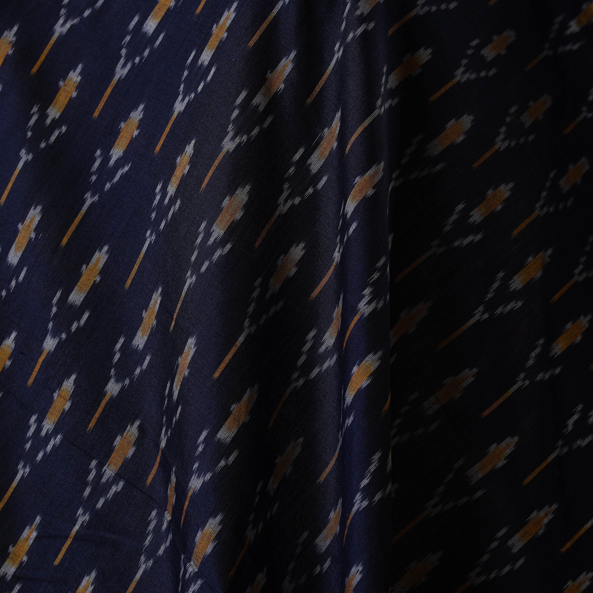 Blue handloom mercerised cotton pochampally ikat fabric from Telangana features vibrant geometric patterns created through a resist-dyeing technique where threads are dyed before weaving. Known for its smooth texture and refined finish, this durable fabric is perfect for clothing and decor, adding a touch of traditional elegance and artisanal charm to every creation.