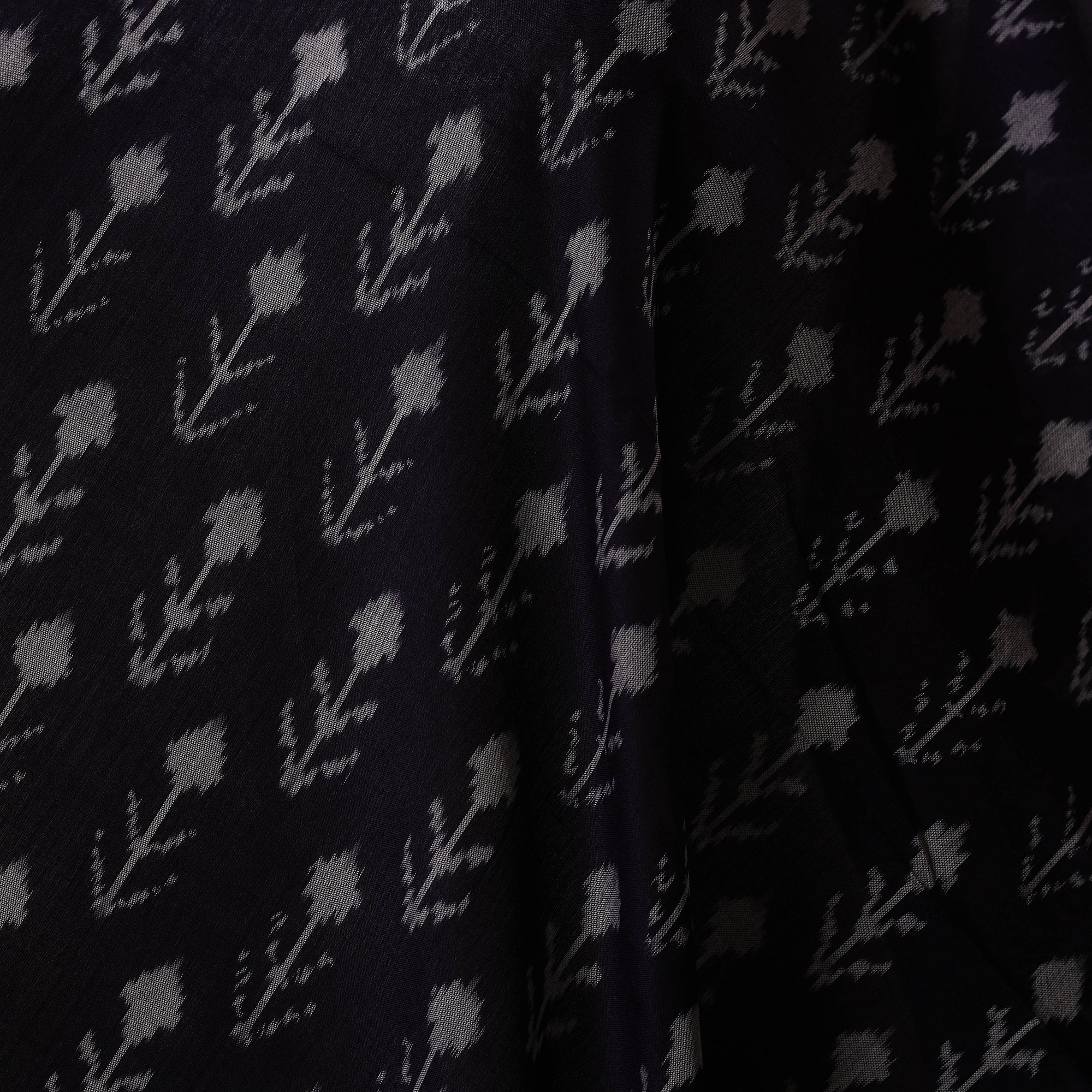 Black handloom mercerised cotton pochampally ikat fabric from Telangana features vibrant geometric patterns created through a resist-dyeing technique where threads are dyed before weaving. Known for its smooth texture and refined finish, this durable fabric is perfect for clothing and decor, adding a touch of traditional elegance and artisanal charm to every creation.