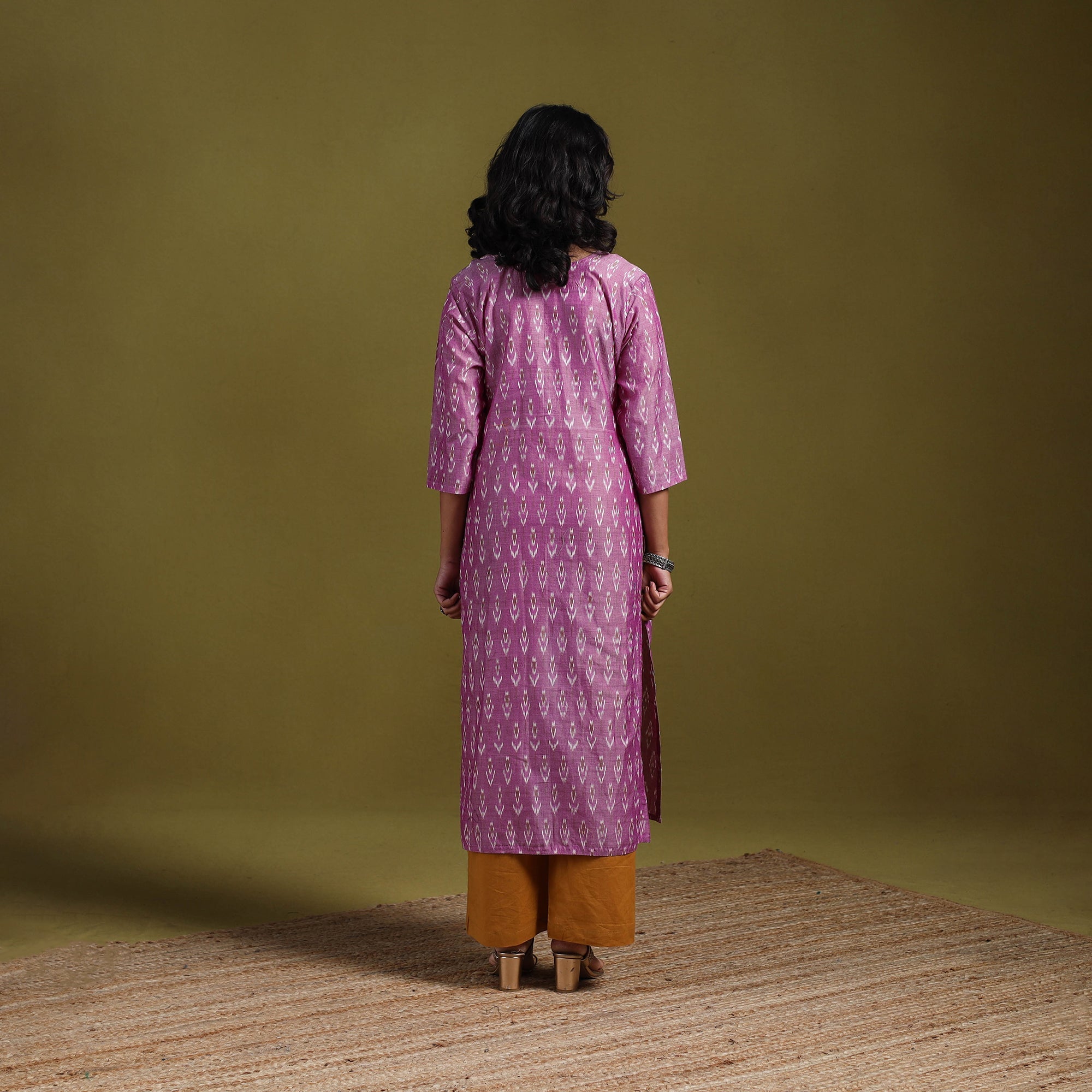 Purple handloom mercerised cotton straight pochampally ikat weave kurta is made using a resist-dye process in which the yarns are dyed before weaving, resulting in detailed geometric patterns. The kurta includes a useful side pocket and offers an easy, relaxed fit, making it suitable for office wear, casual outings and weekend plans.