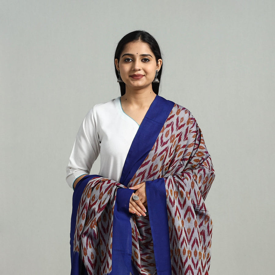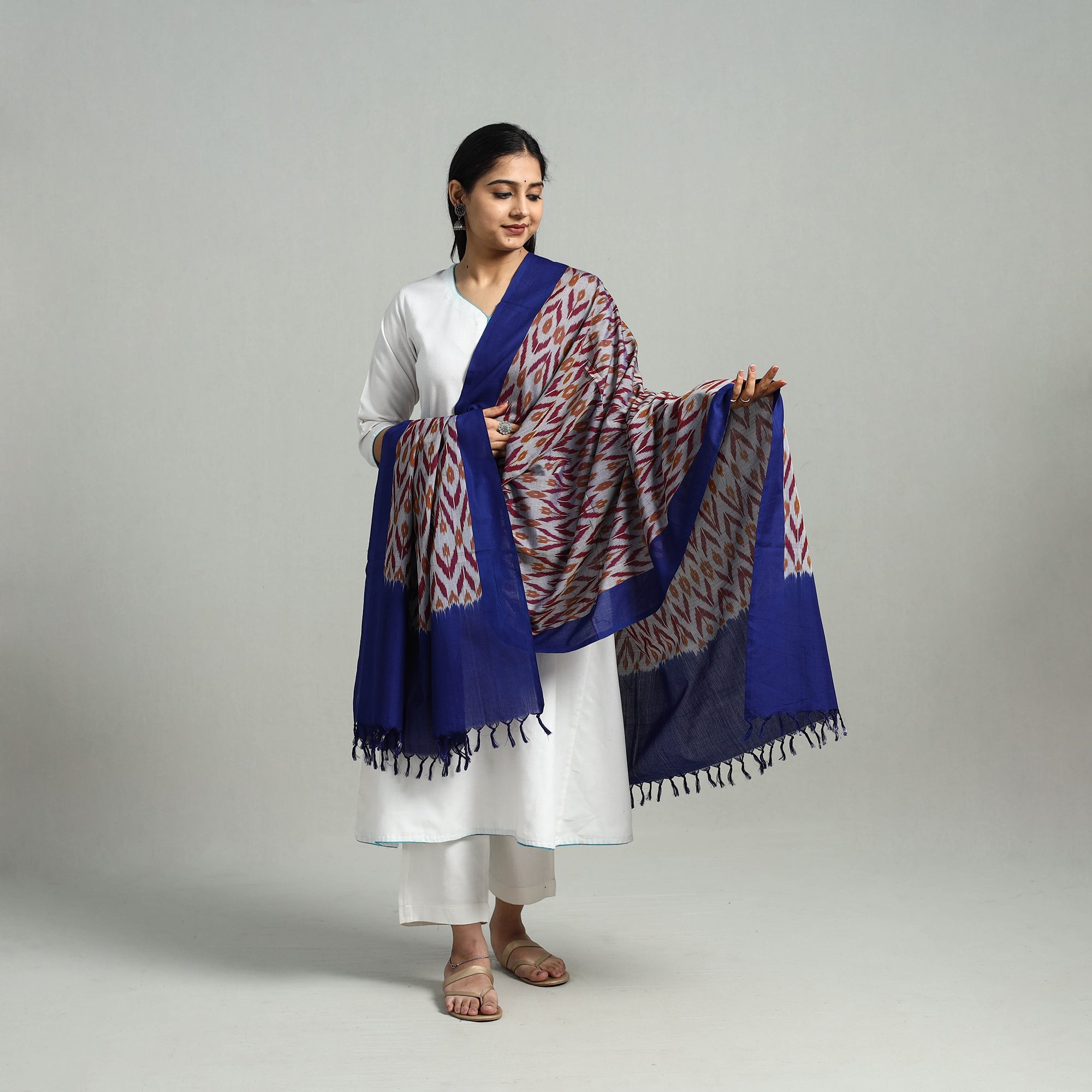 This handloom mercerized cotton blue pochampally ikat dupatta from Telangana features intricate ikat patterns crafted using a traditional resist-dyeing technique. Made from soft, mercerized cotton, it is lightweight and versatile, for pairing with both traditional and modern outfits.