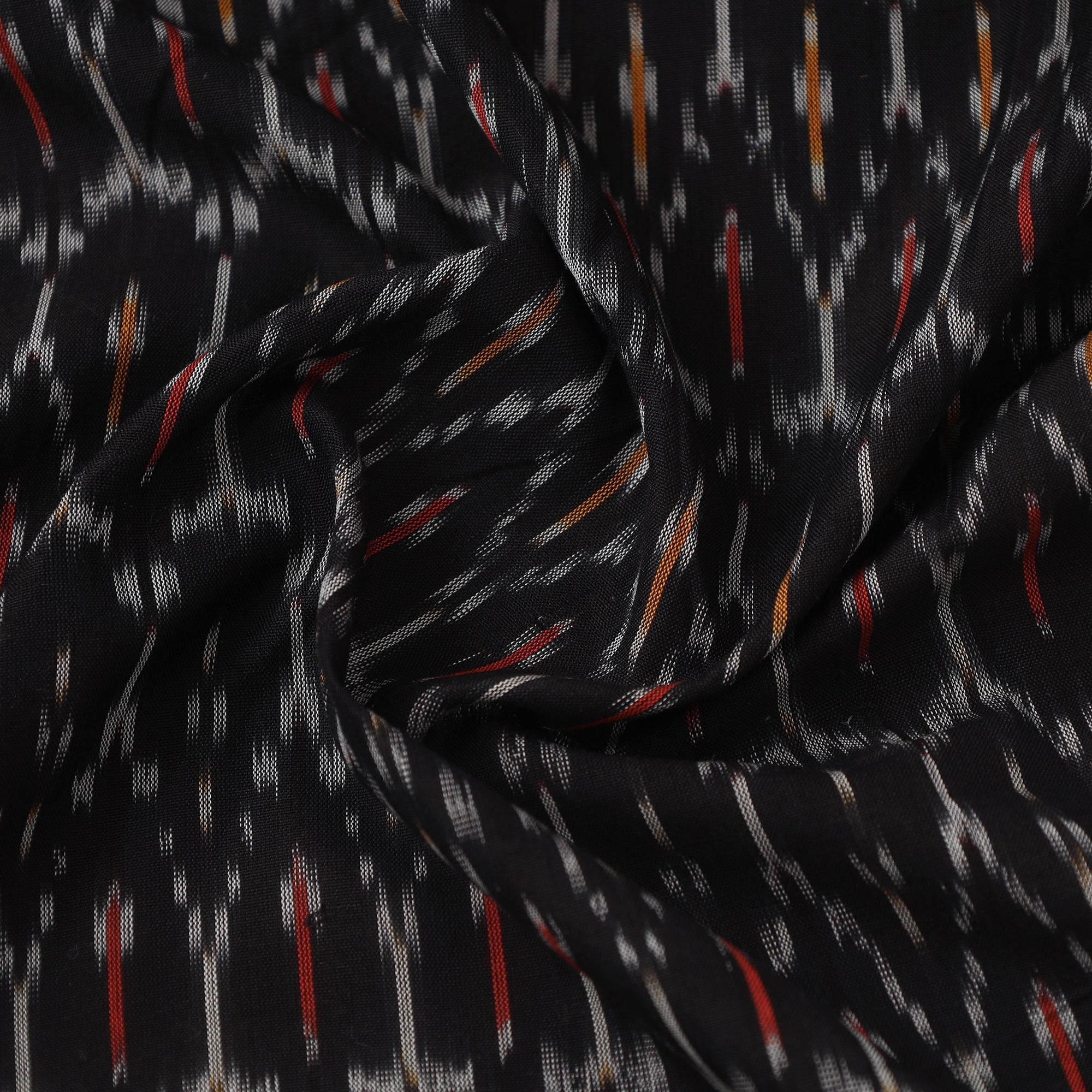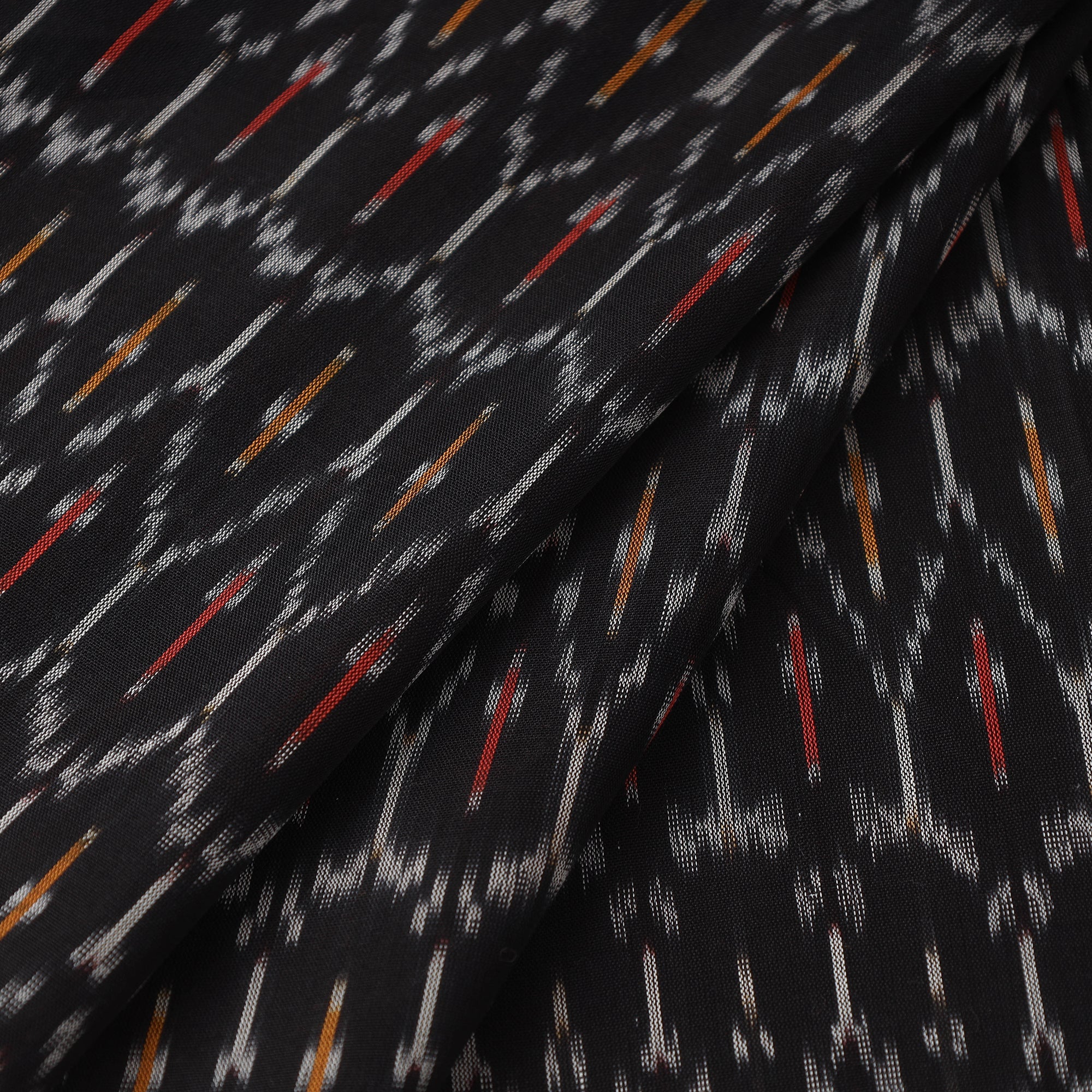 This black handloom pochampally ikat fabric from Telangana is made from mercerized cotton. The patterns are created by dyeing the threads before weaving, using a traditional resist-dyeing method. The fabric is light, comfortable, and suitable for making kurtas, dresses, or home decor items.