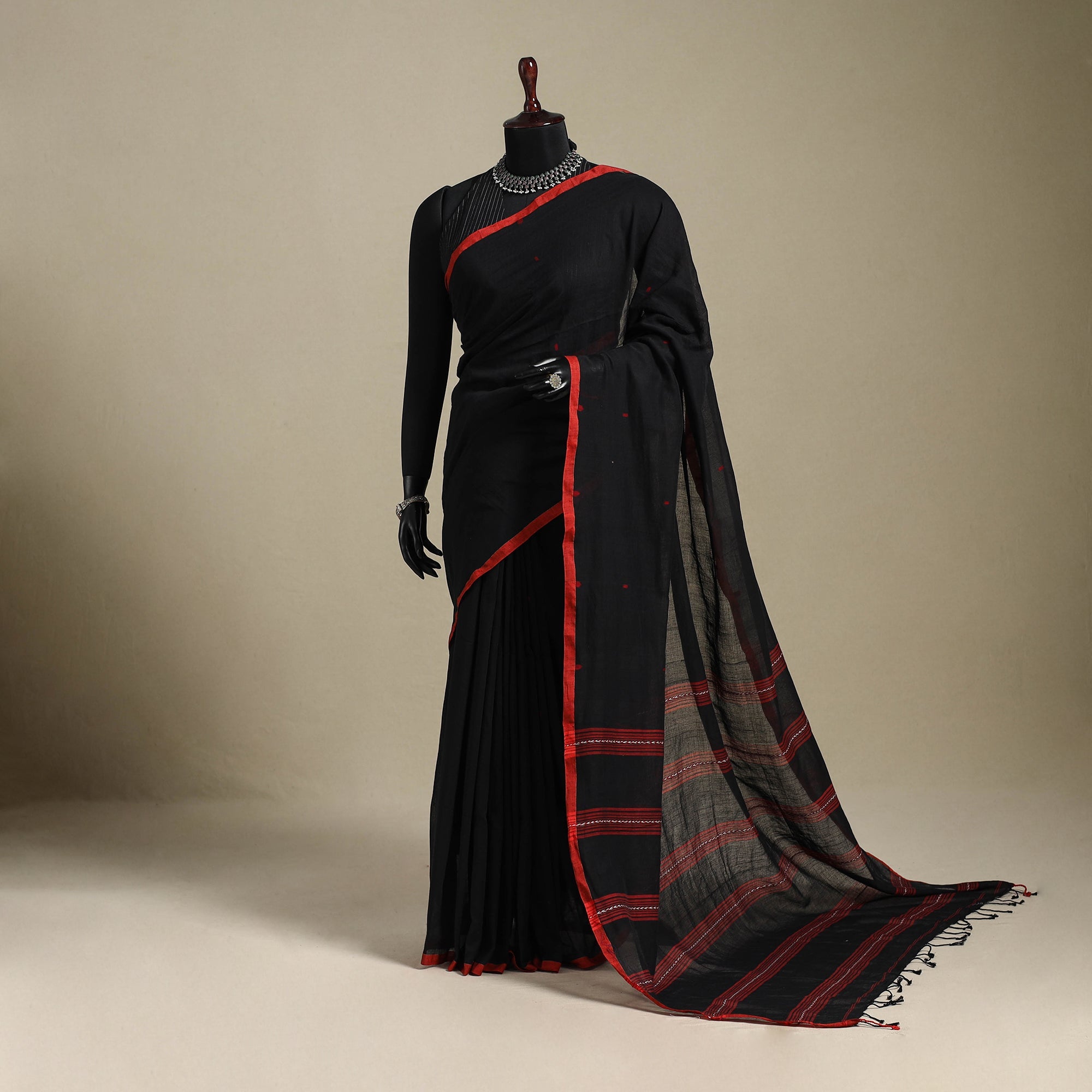 Handwoven in phulia, West Bengal, this black jamdani mulcotton saree brings centuries-old artistry to life. Known for its “extra-weft” technique, the jamdani weave appears like embroidery created directly on the loom, a time-intensive process deeply rooted in Bengal’s textile legacy. Featuring elegant buti motifs and tassels, it is perfect for both festive occasions and casual wear.