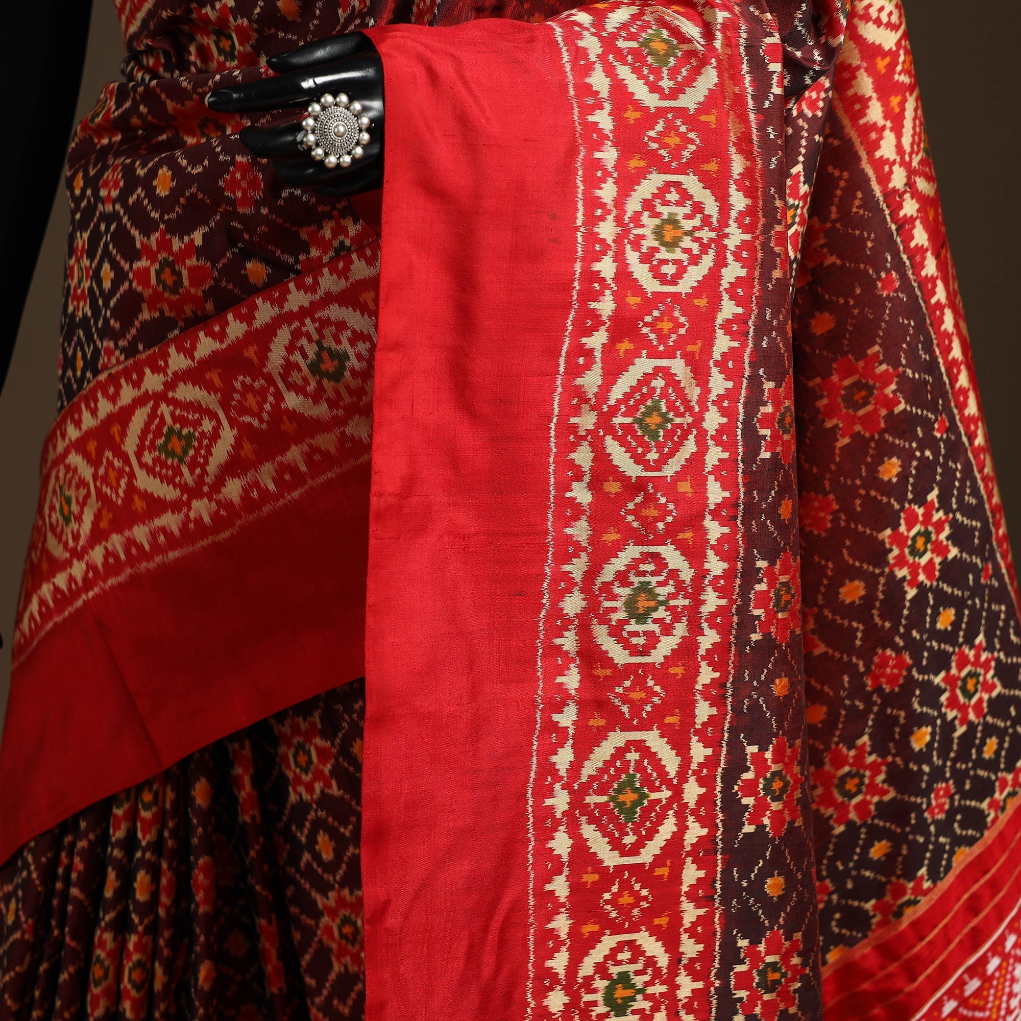 Maroon handloom mulberry silk patola ikat pochampally saree from Telangana showcases detailed patterns created using the traditional resist-dye ikat process. Pochampally ikat is a centuries-old weaving tradition known for its precise thread-dyeing method. The mulberry silk base offers a graceful fall, complemented by vibrant colours and signature geometric motifs. This saree is a beautiful choice for special occasions and for anyone who values authentic Indian textiles.