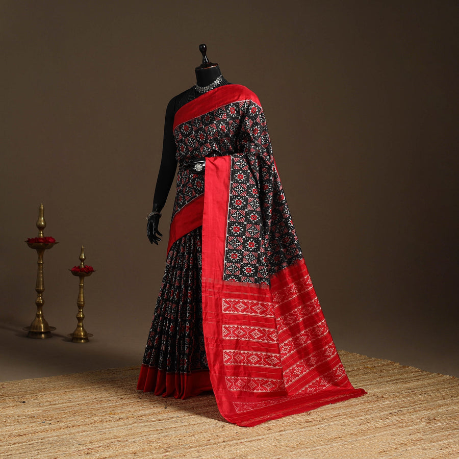 Black handloom mulberry silk patola ikat pochampally saree from Telangana showcases detailed patterns created using the traditional resist-dye ikat process. Pochampally ikat is a centuries-old weaving tradition known for its precise thread-dyeing method. The mulberry silk base offers a graceful fall, complemented by vibrant colours and signature geometric motifs. This saree is a beautiful choice for special occasions and for anyone who values authentic Indian textiles.