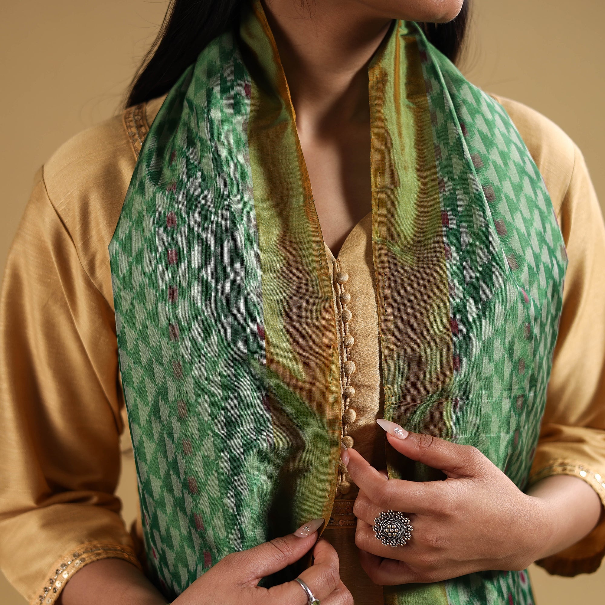 Experience the elegance of green pochampally with this handloom mulberry silk pochampally ikat stole. Handcrafted by skilled pochampally artisans its intricate ikat pattern is created by individually dyed threads. Perfect for pairing with kurtas, suits, or casual western outfits. Lightweight and versatile its perfect for adding a traditional yet modern touch to any outfit.