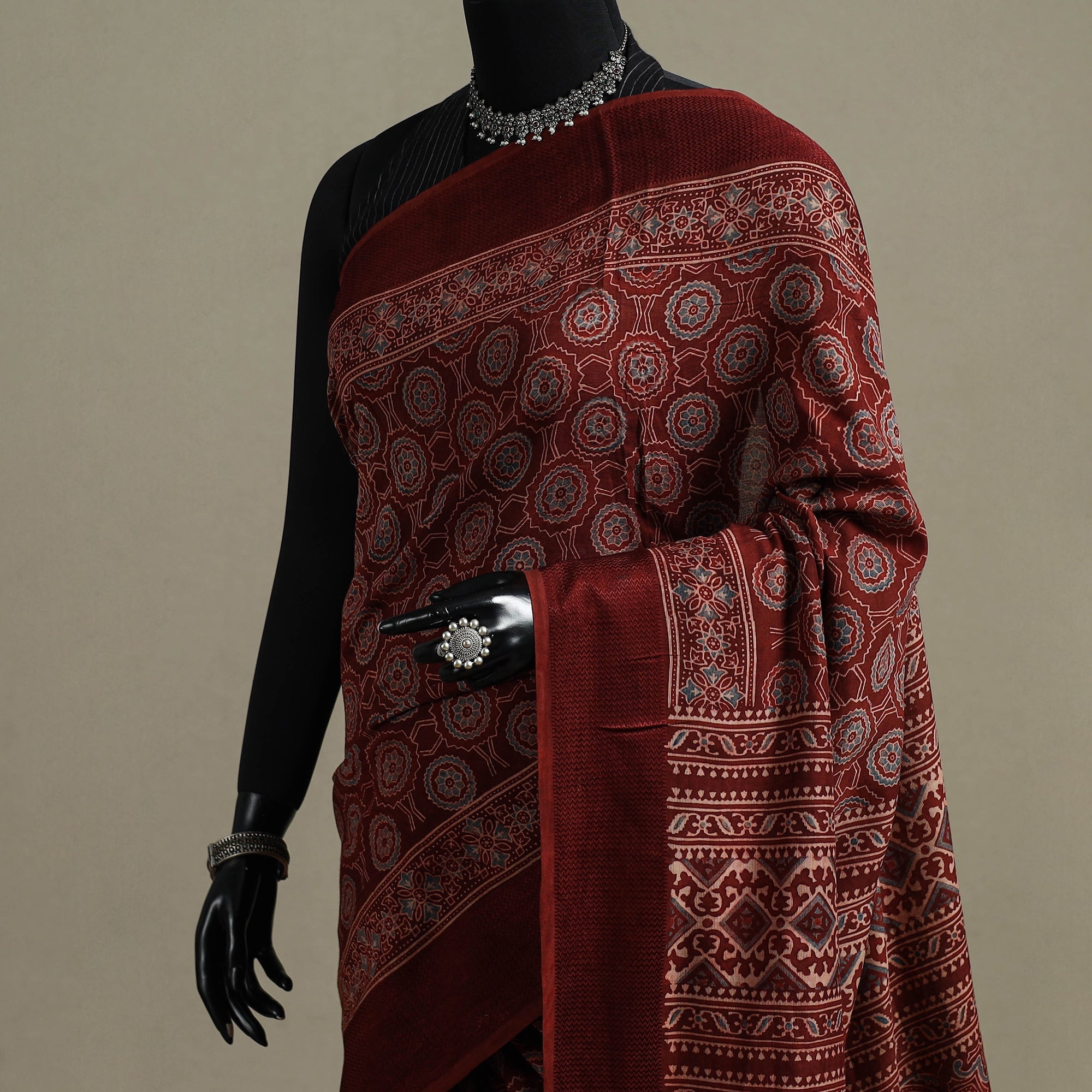 | Material | Traditional maroon ajrakh saree is hand block printed by Riyaz Abdulmajid Khatri. This saree is hand block printed by traditional ajrakh artisan using natural dyes, following a time-honoured craft that originated in Kutch, Gujarat. With a history spanning over 4,500 years, Ajrakh reflects India’s rich cultural legacy. Crafted in maheshwari cotton, the saree is detailed with a border and finished with charming tassels that add an elegant touch. It is well suited for festive occasions, cultural gatherings and graceful everyday wear. A Note on Handmade Beauty |