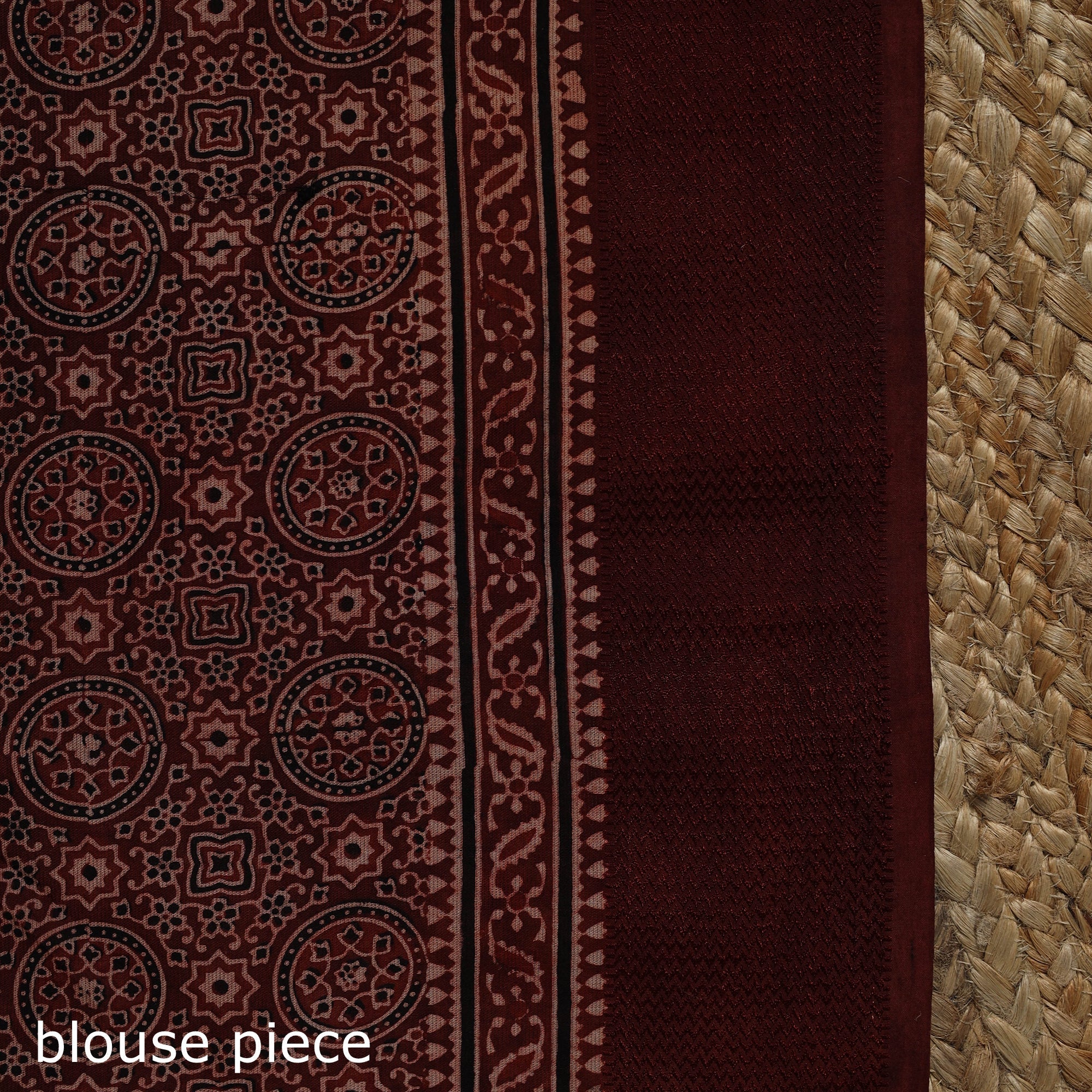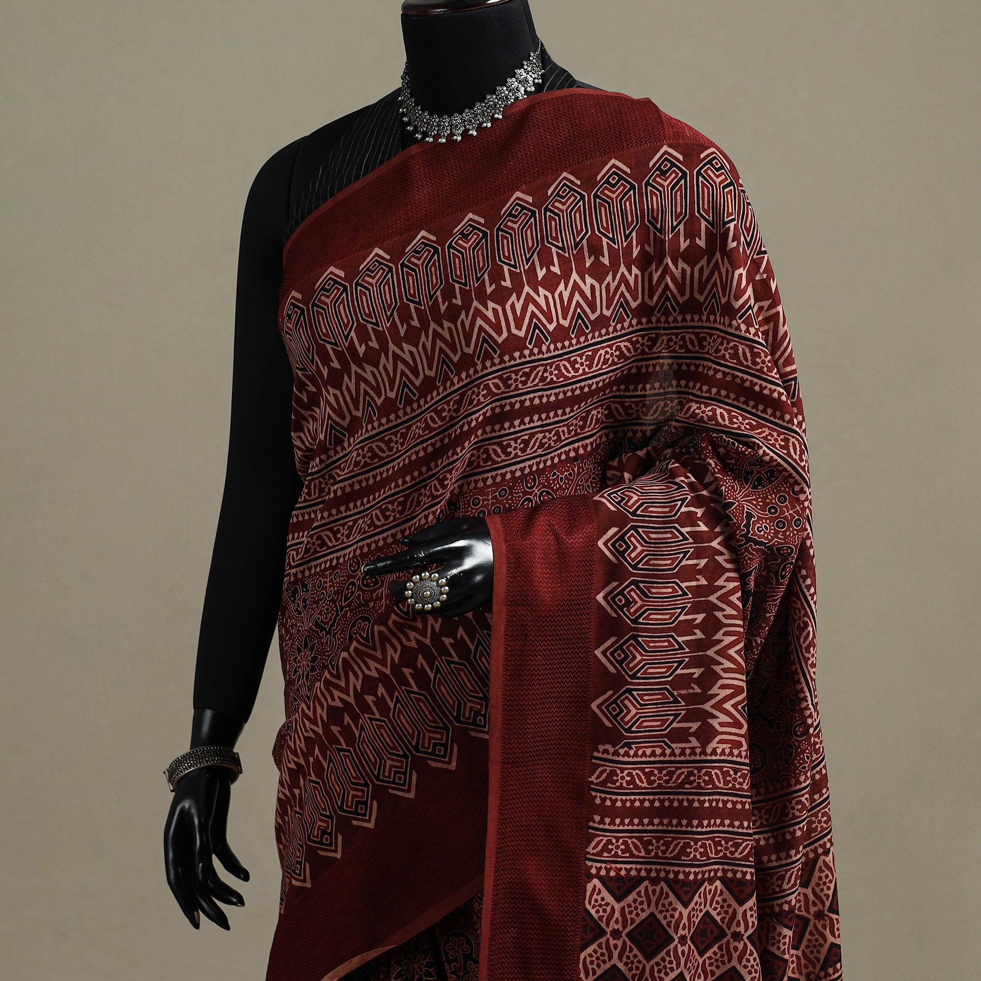 | Material | Traditional maroon ajrakh saree is hand block printed by Riyaz Abdulmajid Khatri. This saree is hand block printed by traditional ajrakh artisan using natural dyes, following a time-honoured craft that originated in Kutch, Gujarat. With a history spanning over 4,500 years, Ajrakh reflects India’s rich cultural legacy. Crafted in maheshwari cotton, the saree is detailed with a border and finished with charming tassels that add an elegant touch. It is well suited for festive occasions, cultural gatherings and graceful everyday wear. A Note on Handmade Beauty |