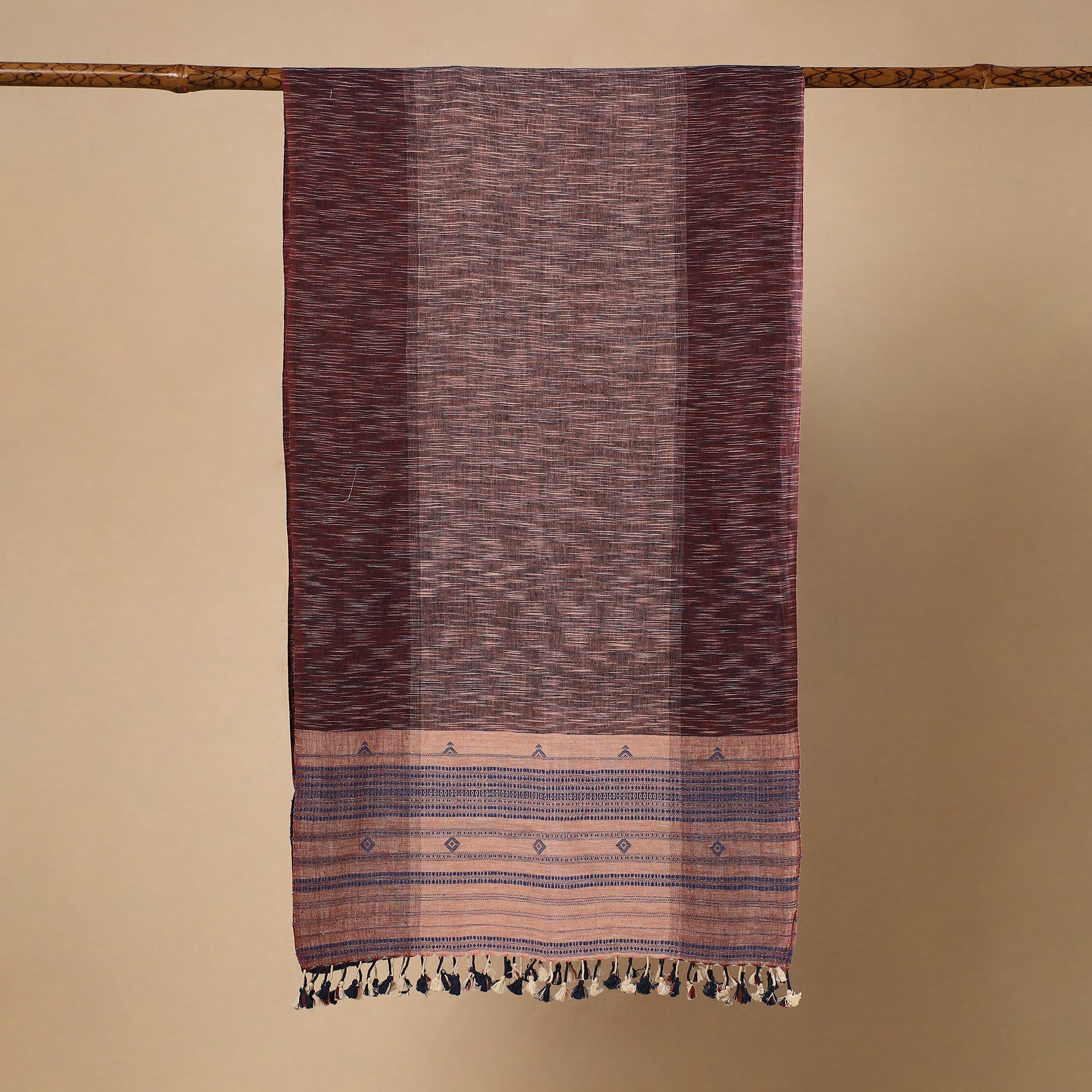 Celebrate the weaving heritage of Kutch with this brown bhujodi stole, handwoven from organic kala cotton by skilled artisans. Kala cotton, known as one of the few genetically pure cotton species of India, is soft, breathable and eco-friendly. Featuring intricate bhujodi patterns and delicate tassels, this stole is perfect to pair with kurtas, dresses or festive outfits.