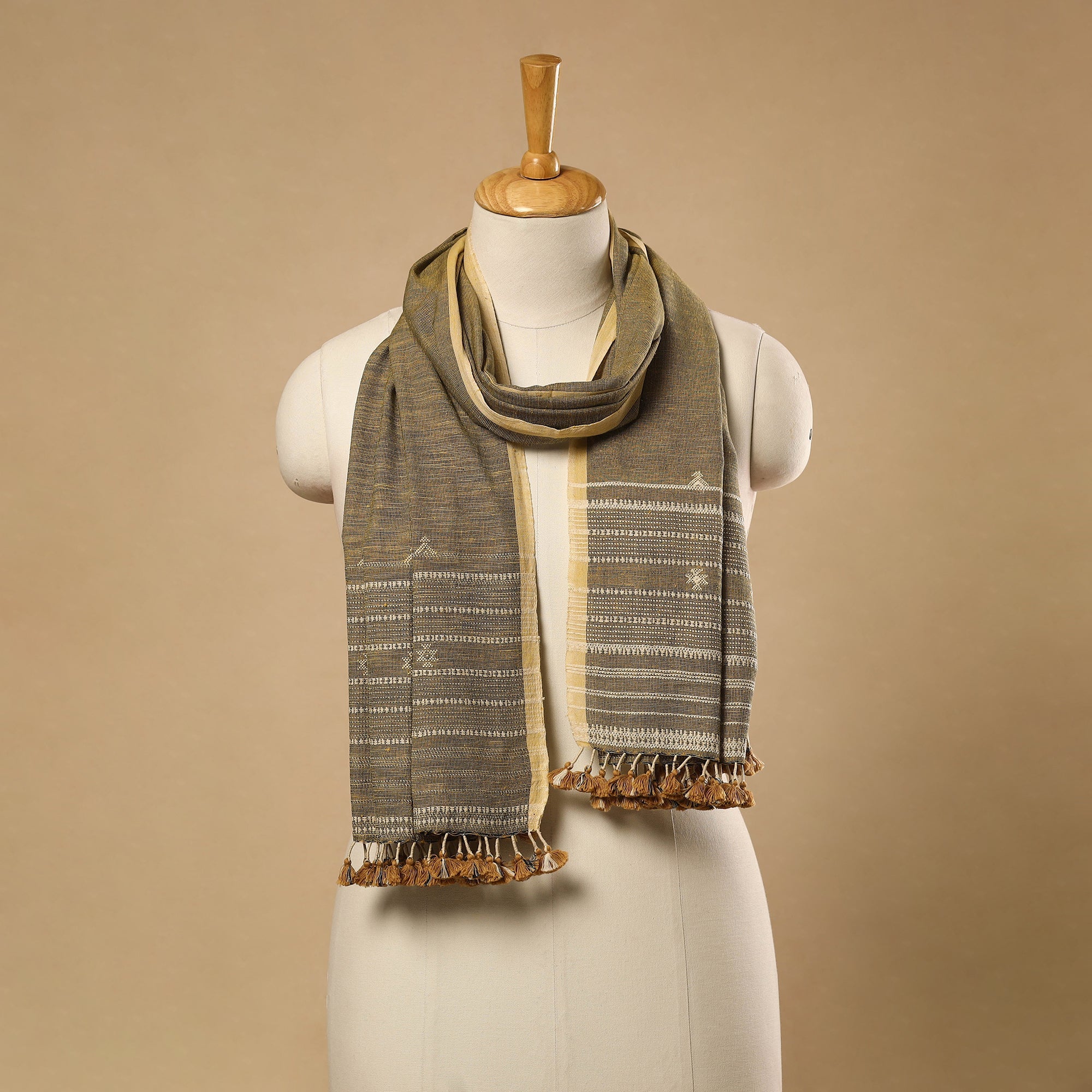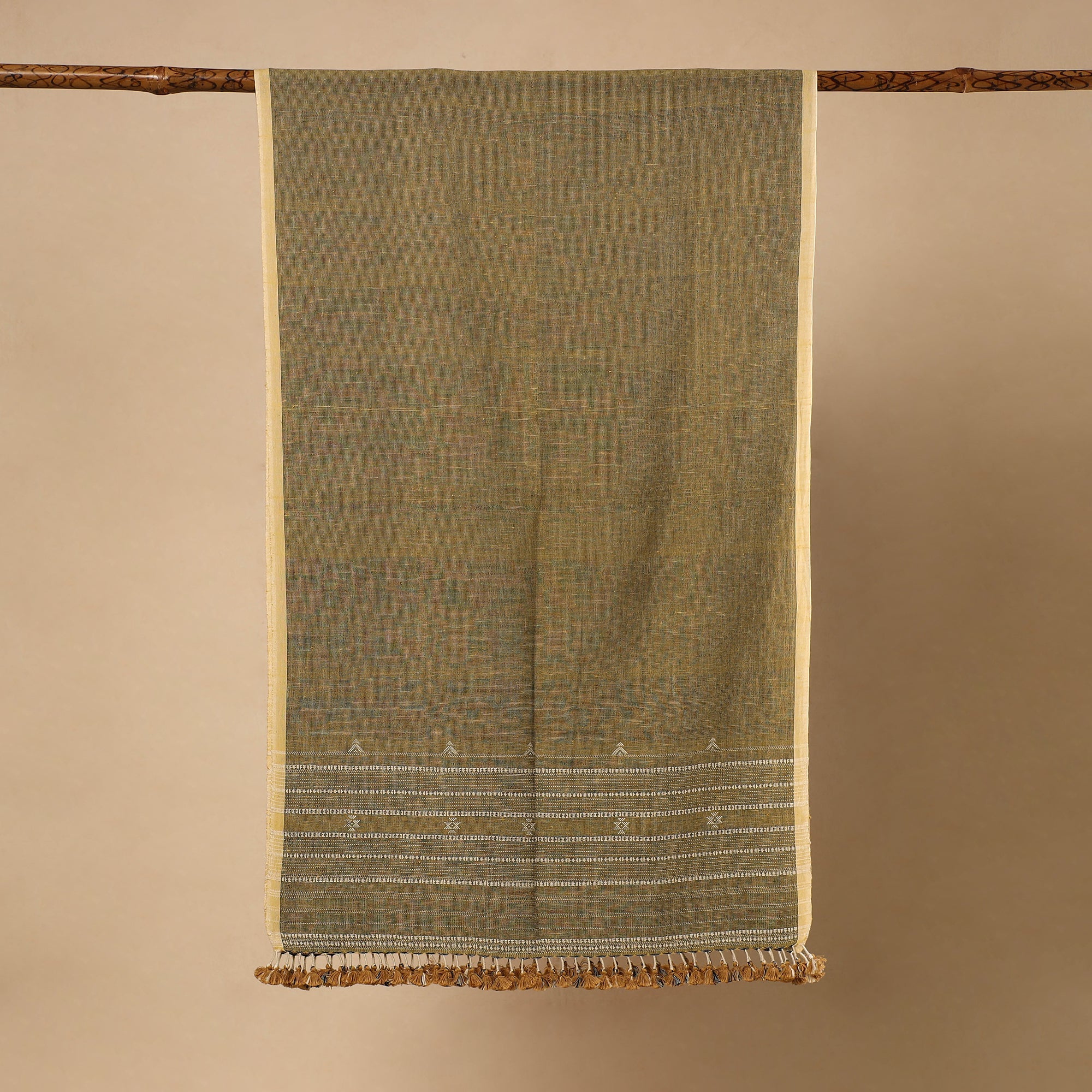 Celebrate the weaving heritage of Kutch with this green bhujodi stole, handwoven from organic kala cotton by skilled artisans. Kala cotton, known as one of the few genetically pure cotton species of India, is soft, breathable and eco-friendly. Featuring intricate bhujodi patterns and delicate tassels, this stole is perfect to pair with kurtas, dresses or festive outfits.